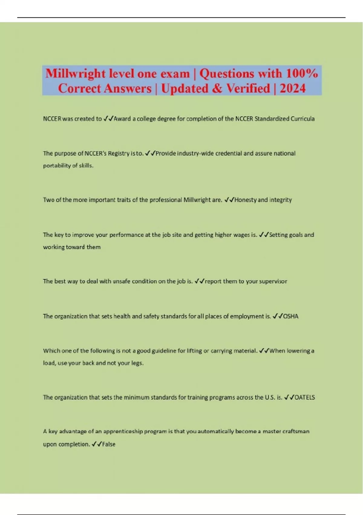 Millwright level one exam | Questions with 100% Correct Answers | Updated & Verified | 2024