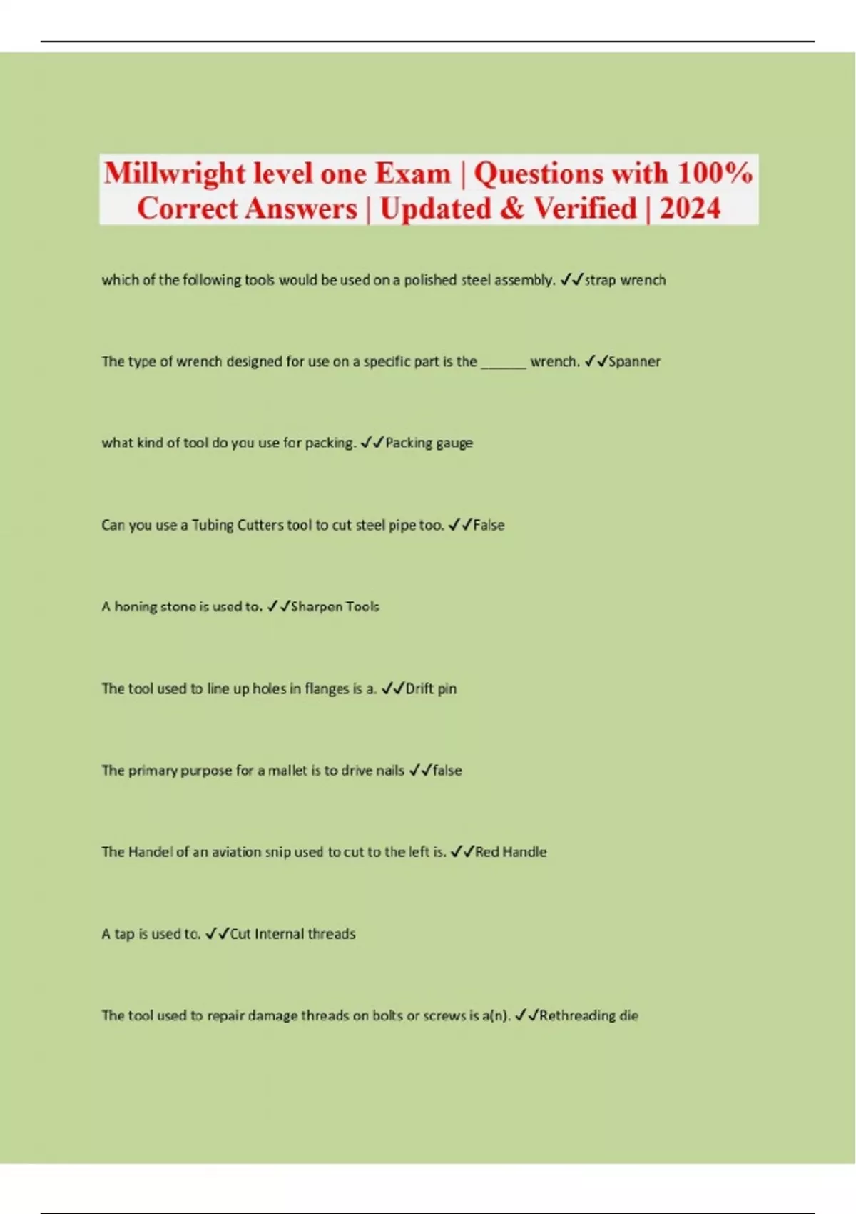 Millwright level one Exam | Questions with 100% Correct Answers | Updated & Verified |