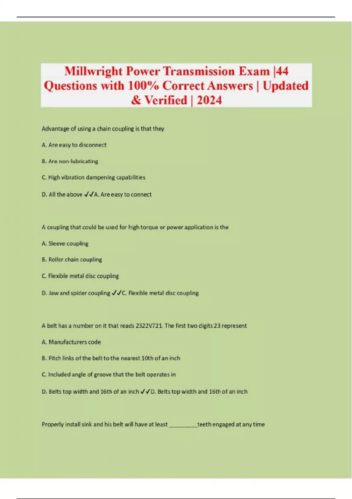 Millwright Power Transmission Exam |44 Questions with 100% Correct Answers | Updated & Verified |