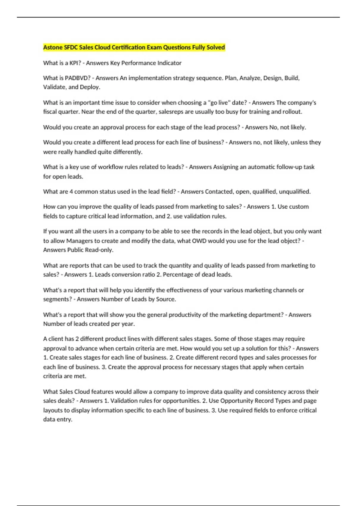 Astone SFDC Sales Cloud Certification Exam Questions Fully Solved What is a KPI? - Answers Key Performance Indicator What is PADBVD? - Answers An implementation strategy sequence. Plan, Analyze, Design, Build, Validate, and Deploy. What is an important time issue to consider when choosing a "go live" date? - Answers The company's fiscal quarter. Near the end of the quarter, salesreps are usually too busy for training and rollout. Would you create an approval process for each stage of the lead process? - Answers No, not likely. Would you create a different lead process for each line of business? - Answers no, not likely, unless they were really handled quite differently. What is a key use of workflow rules related to leads? - Answers Assigning an automatic follow-up task for open leads. What are 4 common status used in the lead field? - Answers Contacted, open, qualified, unqualified. How can you improve the quality of leads passed from marketing to sales? - Answers 1. Use custom fields to capture critical lead information, and 2. use validation rules. If you want all the users in a company to be able to see the records in the lead object, but you only want to allow Managers to create and modify the data, what OWD would you use for the lead object? - Answers Public Read-only. What are reports that can be used to track the quantity and quality of leads passed from marketing to sales? - Answers 1. Leads conversion ratio 2. Percentage of dead leads. What's a report that will help you identify the effectiveness of your various marketing channels or segments? - Answers Number of Leads by Source. What's a report that will show you the general productivity of the marketing department? - Answers Number of leads created per year. A client has 2 different product lines with different sales stages. Some of those stages may require approval to advance when certain criteria are met. How would you set up a solution for this? - Answers 1. Create sales stages for each line of business. 2. Create different record types and sales processes for each line of business. 3. Create the approval process for necessary stages that apply when certain criteria are met. What Sales Cloud features would allow a company to improve data quality and consistency across their sales deals? - Answers 1. Validation rules for opportunities. 2. Use Opportunity Record Types and page layouts to display information specific to each line of business. 3. Use required fields to enforce critical data entry. What is a key way to improve sales productivity through automation? - Answers Use workflow rules to automatically follow-up on tasks. A client wants only sales reps and managers to be able to create and modify sales deals. They also want only the marketing users to be able to report on all sales deals. How would you design a solution for this need? - Answers 1. Use the Private sharing model for Opportunities. 2. Use role hierarchies. 3. Create a sharing rule to share all sale deals with marketing. in a Private sharing model for sales, what could you do to make it easier for sales and marketing to work together? - Answers 1. Create sales teams for specific opportunities. 2. Enable feed tracking for opportunities. What are ways to help a company improve the accuracy of its revenue and quantity forecasts? - Answers 1. Allow management to adjust forecasts. 2. Align opportunity stages with the correct forecast category. What sort of report would you use to track lead conversion time metrics? - Answers A custom report for leads. What sort of report would you use to track the time it takes to close deals? - Answers A custom report for opportunities. What sort of report would you use to track the number of open deals at each stage? - Answers The standard Opportunity Pipeline report. What sort of report would you use to track the length of time a deal is at each stage? - Answers The standard Opportunity Stage Duration Report. A client says they want a 360 degree view of their accounts. What would you do to ensure this? - Answers Ensure that the appropriate related lists are on the accont page layout. How would you design a solution to update the contact addresses when an account address is changed? - Answers Create an Apex trigger on accounts to update contacts when the account address is changed. What kind of report would you use to track the industries that a client works with the most? - Answers A custom report on Accounts based on the industry field. If you have multiple campaigns, but they capture the same information, should you use one or many page layouts? - Answers One. What Sales Cloud feature would allow you to track which campaigns have directly led to sales deals? - Answers Campaign Influence. What Sales Cloud feature allows you to track which campaigns are related to a specific program initiative? - Answers Campaign hierarchy, which allows campaigns to be grouped within a specific program. What report will allow you to measure the ROI of investments in each campaign? - Answers The (Value won opportunities-campaign cost) /campaign cost report. What report will show you the pipeline generated by each campaign?