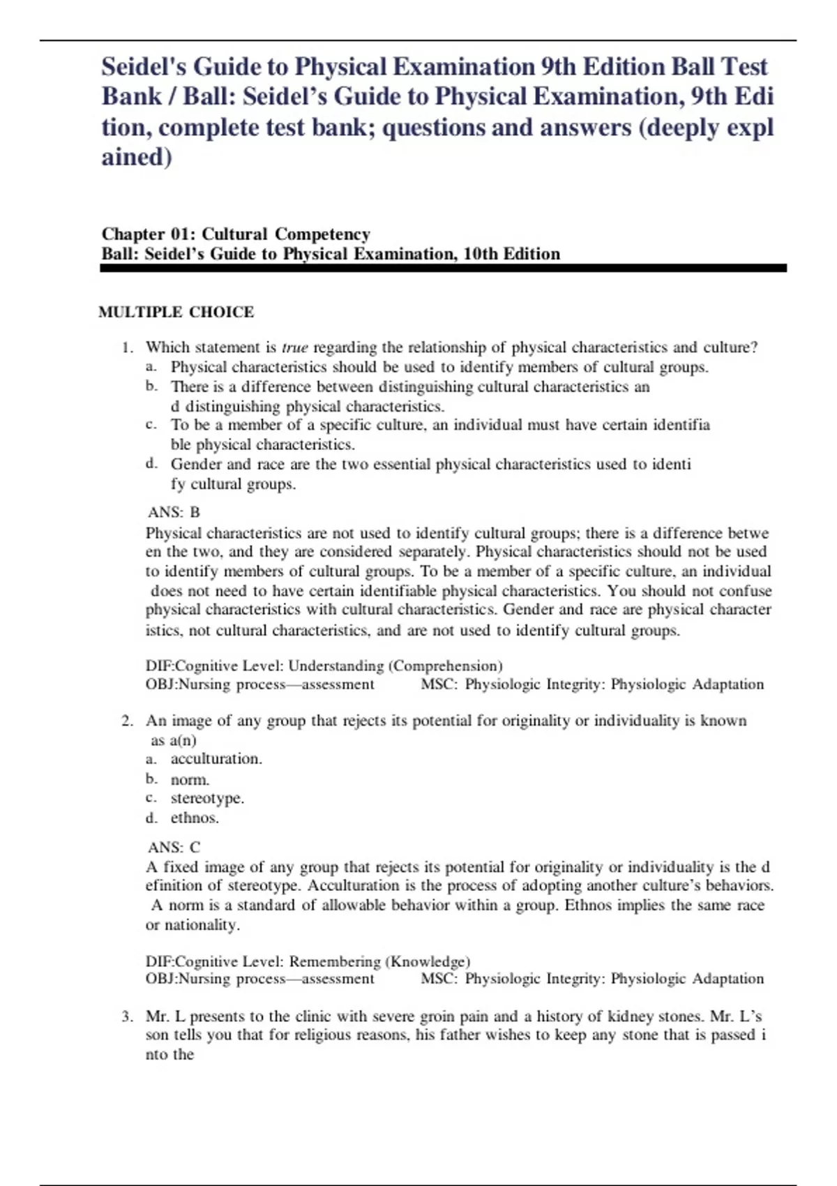 Test Bank For Seidel's Guide to Physical Examination 9th Edition By Jane W. Ball; Joyce E. Dains; John A. Flynn; Barry S Solomon; Rosalyn W Stewart 9780323481953 Chapter 1-26 Complete G