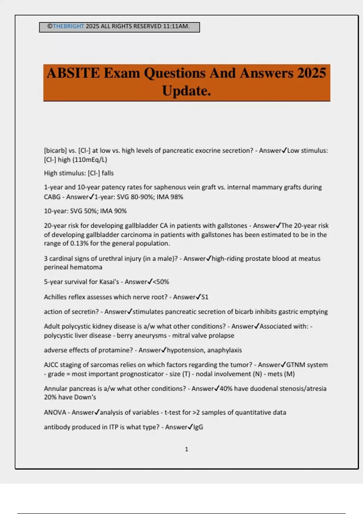 ©THEBRIGHT 2025 ALL RIGHTS RESERVED 11:11AM. 1 ABSITE Exam Questions And Answers 2025 Update. [bicarb] vs. [Cl-] at low vs. high levels of pancreatic exocrine secretion? - AnswerLow stimulus: [Cl-] high (110mEq/L) High stimulus: [Cl-] falls 1-year and 10-year patency rates for saphenous vein graft vs. internal mammary grafts during CABG - Answer1-year: SVG 80-90%; IMA 98% 10-year: SVG 50%; IMA 90% 20-year risk for developing gallbladder CA in patients with gallstones - AnswerThe 20-year risk of developing gallbladder carcinoma in patients with gallstones has been estimated to be in the range of 0.13% for the general population. 3 cardinal signs of urethral injury (in a male)? - Answerhigh-riding prostate blood at meatus perineal hematoma 5-year survival for Kasai's - Answer<50% Achilles reflex assesses which nerve root? - AnswerS1 action of secretin? - Answerstimulates pancreatic secretion of bicarb inhibits gastric emptying Adult polycystic kidney disease is a/w what other conditions? - AnswerAssociated with: - polycystic liver disease - berry aneurysms - mitral valve prolapse adverse effects of protamine? - Answerhypotension, anaphylaxis AJCC staging of sarcomas relies on which factors regarding the tumor? - AnswerGTNM system - grade = most important prognosticator - size (T) - nodal involvement (N) - mets (M) Annular pancreas is a/w what other conditions? - Answer40% have duodenal stenosis/atresia 20% have Down's ANOVA - Answeranalysis of variables - t-test for >2 samples of quantitative data antibody produced in ITP is what type? - AnswerIgG ©THEBRIGHT 2025 ALL RIGHTS RESERVED 11:11AM. 2 Antidiuretic hormone (ADH) is secreted in response to? - Answerhypovolemia (most powerful stimulant) increased serum osmolality Appearance of cholesterol polyps? - AnswerAppear as yellow spots on gallbladder mucosa appearance of duodenal atresia on plain film? - Answerdouble bubble sign due to gastric bubble + bubble bounded by pylorus and obstruction Appropirate crystalloid bolus for treating shock in an infant - Answer20 cc/kg Appropriate fluid bolus for resuscitating a pediatric patient? - Answerpremature and infants < 1.5 kg: 150 cc/kg neonates and infants 1.5 - 10kg: 100 cc/kg for 1st 10 kg infants and children 10-20kg: 50 cc /kg per kg over 10 kg children > 20 kg: 1 Appropriate mgt of choledochal cysts? - Answerexcision with clean margins biliary drainage with Roux-en-Y NOTE: some will treat type II with excision and reconstruction of bile duct wall Are chemotherapeutics for breast cancer safe during pregnancy? - AnswerAgents most commonly used in initial management are relatively safe during 2nd/3rd trimester - safe: cyclophosphamide Are femoral hernias medial or lateral to the femoral vein? - Answermedial are insulinomas usually malignant or benign? - Answer> 95% are benign are patients with Hashimoto's at increased risk for thyroid malignancy? - Answerslightly increased risk for malignancy (thyroid lymphoma) - no increased risk for other thyroid cancers Are patients with Hashimoto's hypothyroid - Answereuthyroid Are pediatric inguinal hernias usually direct or indirect? - Answeralmost always indirect Are Peutz-Jeghers polyps premalignant? What is the mgt of Peutz-Jegher pts? - AnswerNO Are pheochromocytomas tumors of the adrenal cortex or medulla? - Answertumors of adrenal medulla Are proton-pump inhibitors a/w carcinoid tumors? - AnswerNO Are the renal pelvices anterior or posterior to renal arteries? - Answerrenal pelvices are posterior to renal arteries At what age does pyloric stenosis usually first manifest? - Answerat 3 to 12 weeks of age starts with nonbilious vomiting which eventually becomes projectile At what age(s) does gynecomastia usually occur? - AnswerOccurs during three phases of life At what compartment pressure is a fasciotomy indicated? - AnswerMay be needed for compartment pressures > 30 mm Hg - 30-45 watch carefully - greater than 45 usually needs intervention ©THEBRIGHT 2025 ALL RIGHTS RESERVED 11:11AM. 3 At what joints does Dupuytren's contracture develop? - AnswerMCP and PIP joints - begins as nodule formation/proliferation of palmar fascia At what pO2 is hemoglobin 50% saturated under normal conditions? - Answer27 At what point in the cell cycle do most chemotherapeutics act? - AnswerS phase At what point in the respiratory cycle do you measure PCWP? - Answeron mechanical ventilation: at bottom of waveform (end-expiration) spontaneously respiring: at top of waveform (end-inspiration) The idea is to eliminate intra-thoracic pressure as a confounding factor. at what point in the trachea does the recurrent laryngeal nerve enter? - Answerat the cricothyroid articulation at what size should an asymptomatic popliteal aneurysm be repaired? - Answerat greater than 2 cm At what spinal level does the spinal artery of Adamkiewicz usually arise? - AnswerT9-T12 at what vertebral level are found the cardiac accelerator fibers? - AnswerT1-T4 - can be hit with thoracic epidurals note: MSO4 epidurals have wider "spread" than Fentanyl ATPs from anaerobic glycolysis - Answer2 and 1 lactate ATPs from Kreb's cycle - Answer38 from 1 glucose Average age at diagnosis of LCIS? - Answer44-47 - two thirds of patients are pre-menopausal Average time lapse between radiation treatment for breast cancer and presentation of radiation-induced sarcoma? - Answer10 years - recurrences after this much time should be considered with high suspicion for sarcoma rather than primary lesion bacteria implicated in Fournier's gangrene? - AnswerBacteroides best method for biopsy of a melanoma? - Answerfull-thickness biopsy - important to be able to gauge the thickness of the tumor in order to stage accurately best serum test to assess recurrence in a medullary thyroid patient? - Answerpentagastrin- stimulated calcitonin Best test for distinguishing ATN from prerenal azotemia? - Answerfractional excretion of sodium best therapy for colon mass identified during routine cholecystectomy? - Answercomplete procedur