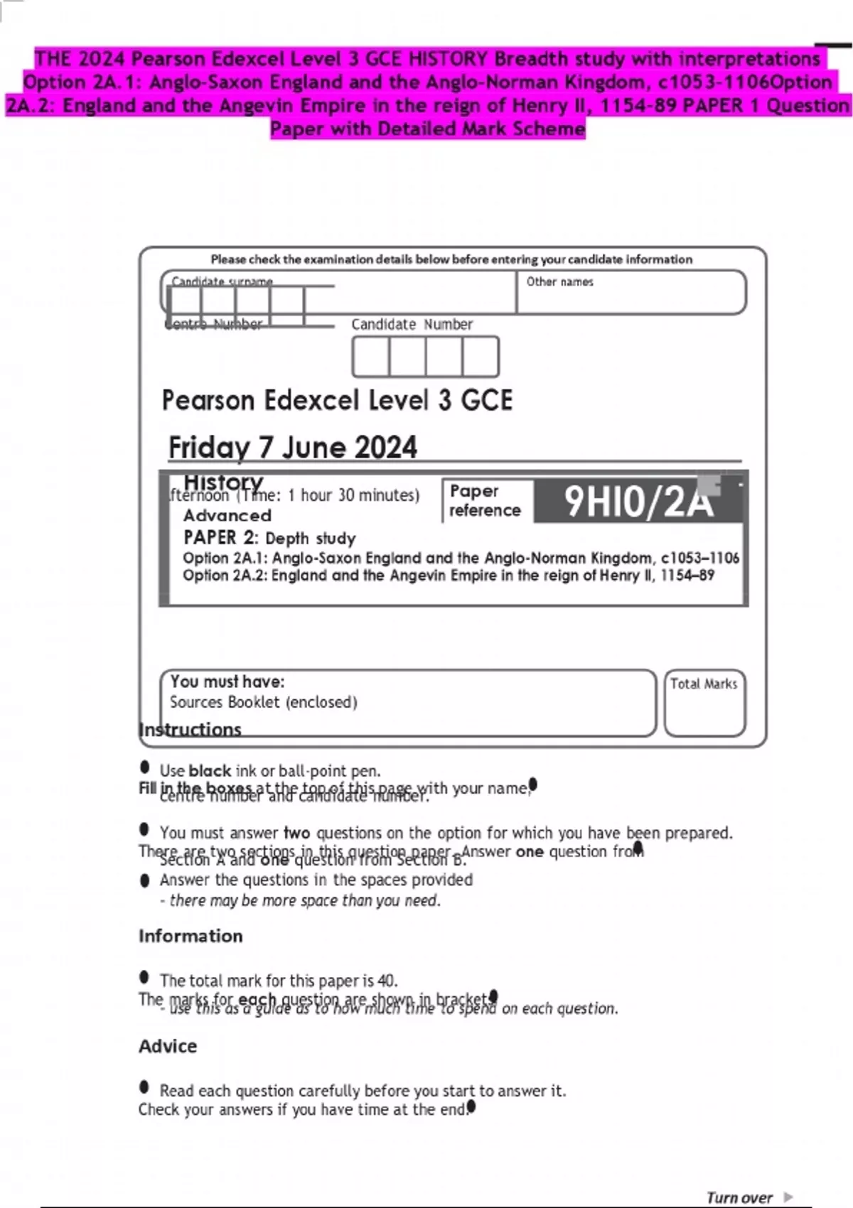 THE 2024 Pearson Edexcel Level 3 GCE HISTORY Breadth study with interpretations Option 2A.1: Anglo-Saxon England and the Anglo-Norman Kingdom, c1053–1106Option 2A.2: England and the Angevin Empire in the reign of Henry II, 1154–89 PAPER 1 Question Paper with Detailed Mark Scheme