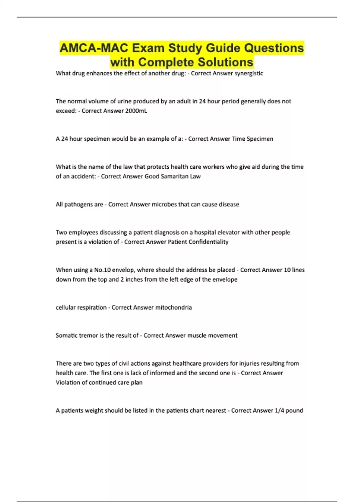AMCA-MAC Exam Study Guide Questions with Complete Solutions What drug enhances the effect of another drug: - Correct Answer synergistic The normal volume of urine produced by an adult in 24 hour period generally does not exceed: - Correct Answer 2000mL A 24 hour specimen would be an example of a: - Correct Answer Time Specimen What is the name of the law that protects health care workers who give aid during the time of an accident: - Correct Answer Good Samaritan Law All pathogens are - Correct Answer microbes that can cause disease Two employees discussing a patient diagnosis on a hospital elevator with other people present is a violation of - Correct Answer Patient Confidentiality When using a No.10 envelop, where should the address be placed - Correct Answer 10 lines down from the top and 2 inches from the left edge of the envelope cellular respiration - Correct Answer mitochondria Somatic tremor is the result of - Correct Answer muscle movement