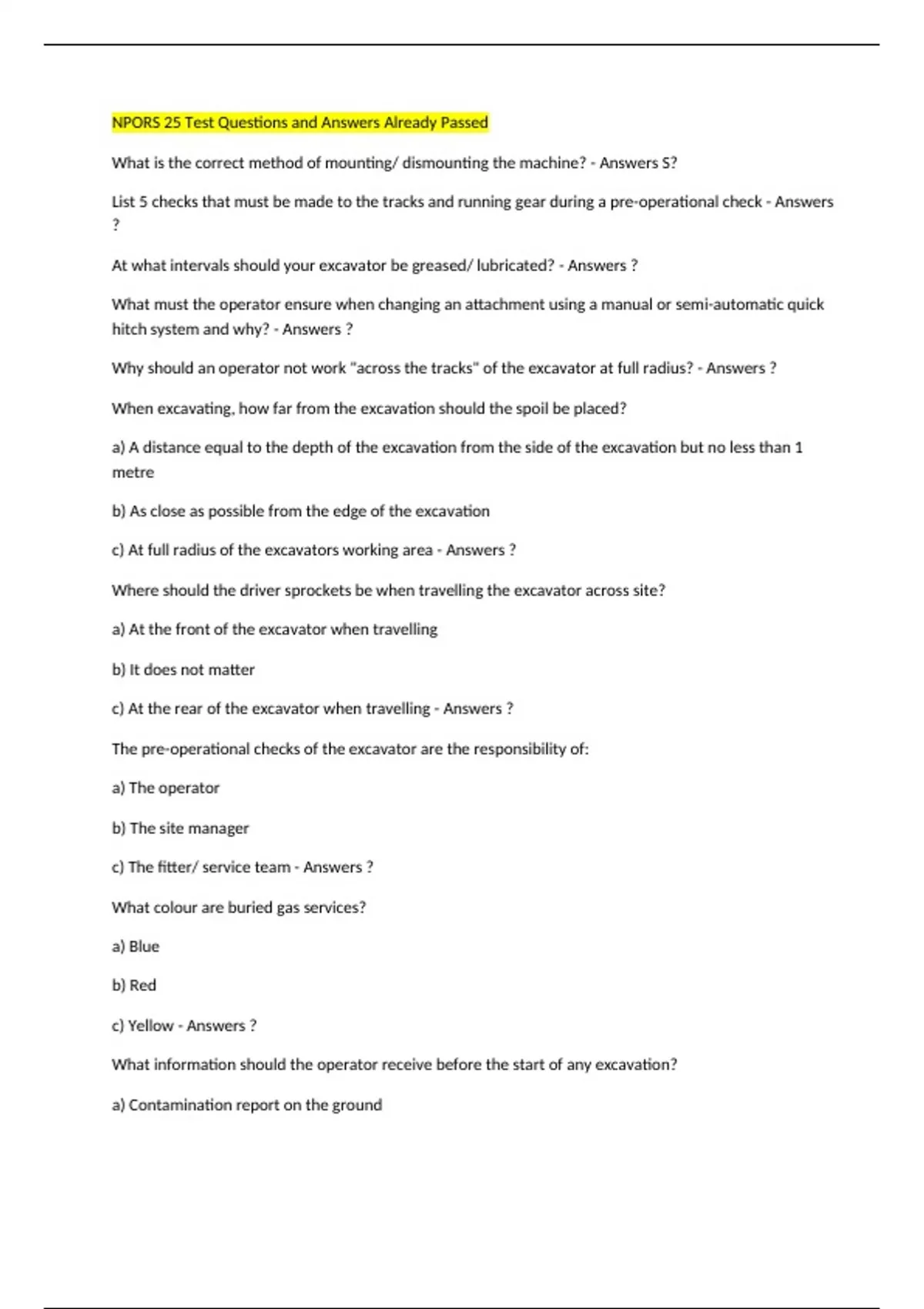 c) At the rear of the excavator when travelling - Answers ?
