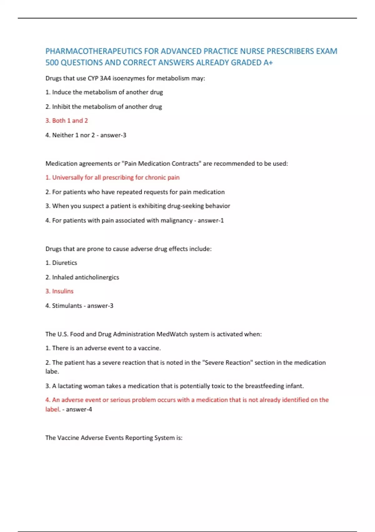 PHARMACOTHERAPEUTICS FOR ADVANCED PRACTICE NURSE PRESCRIBERS EXAM 500 QUESTIONS AND CORRECT ANSWERS ALREADY GRADED A+ PHARMACOTHERAPEUTICS FOR ADVANCED PRACTICE NURSE PRESCRIBERS EXAM 500 QUESTIONS AND CORRECT ANSWERS ALREADY GRADED A+