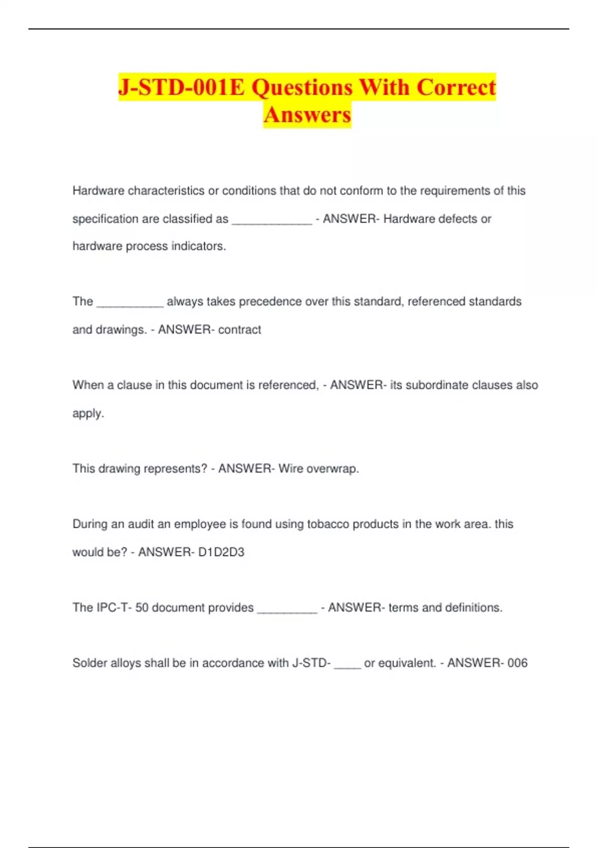 J-STD-001E Questions With Correct Answers Hardware characteristics or conditions that do not conform to the requirements of this specification are classified as ____________ - ANSWER- Hardware defects or hardware process indicators. The __________ always takes precedence over this standard, referenced standards and drawings. - ANSWER- contract When a clause in this document is referenced, - ANSWER- its subordinate clauses also apply.