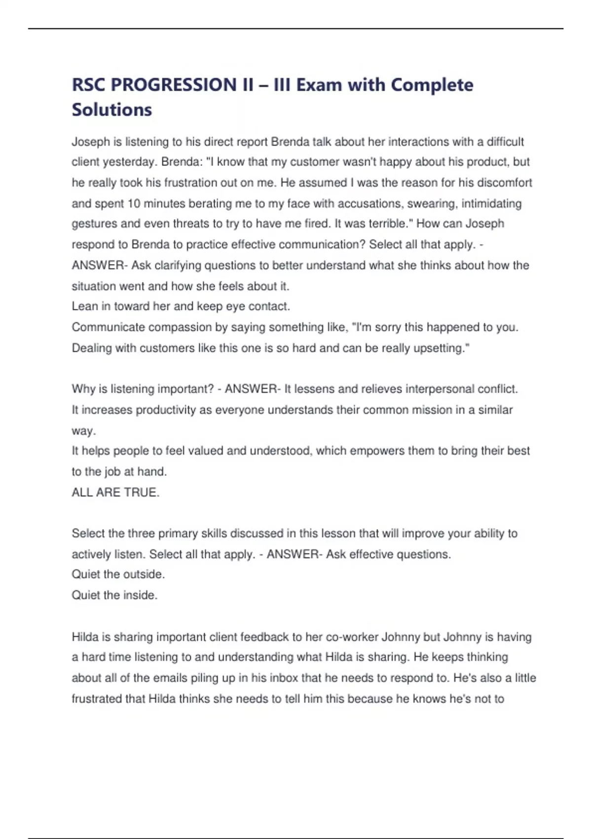 RSC PROGRESSION II – III Exam with Complete Solutions Joseph is listening to his direct report Brenda talk about her interactions with a difficult client yesterday. Brenda: "I know that my customer wasn't happy about his product, but he really took his frustration out on me. He assumed I was the reason for his discomfort and spent 10 minutes berating me to my face with accusations, swearing, intimidating gestures and even threats to try to have me fired. It was terrible." How can Joseph respond to Brenda to practice effective communication? Select all that apply. - ANSWER- Ask clarifying questions to better understand what she thinks about how the situation went and how she feels about it. Lean in toward her and keep eye contact. Communicate compassion by saying something like, "I'm sorry this happened to you. Dealing with customers like this one is so hard and can be really upsetting." Why is listening important? - ANSWER- It lessens and relieves interpersonal conflict. It increases productivity as everyone understands their common mission in a similar way. It helps people to feel valued and understood, which empowers them to bring their best to the job at hand. ALL ARE TRUE.