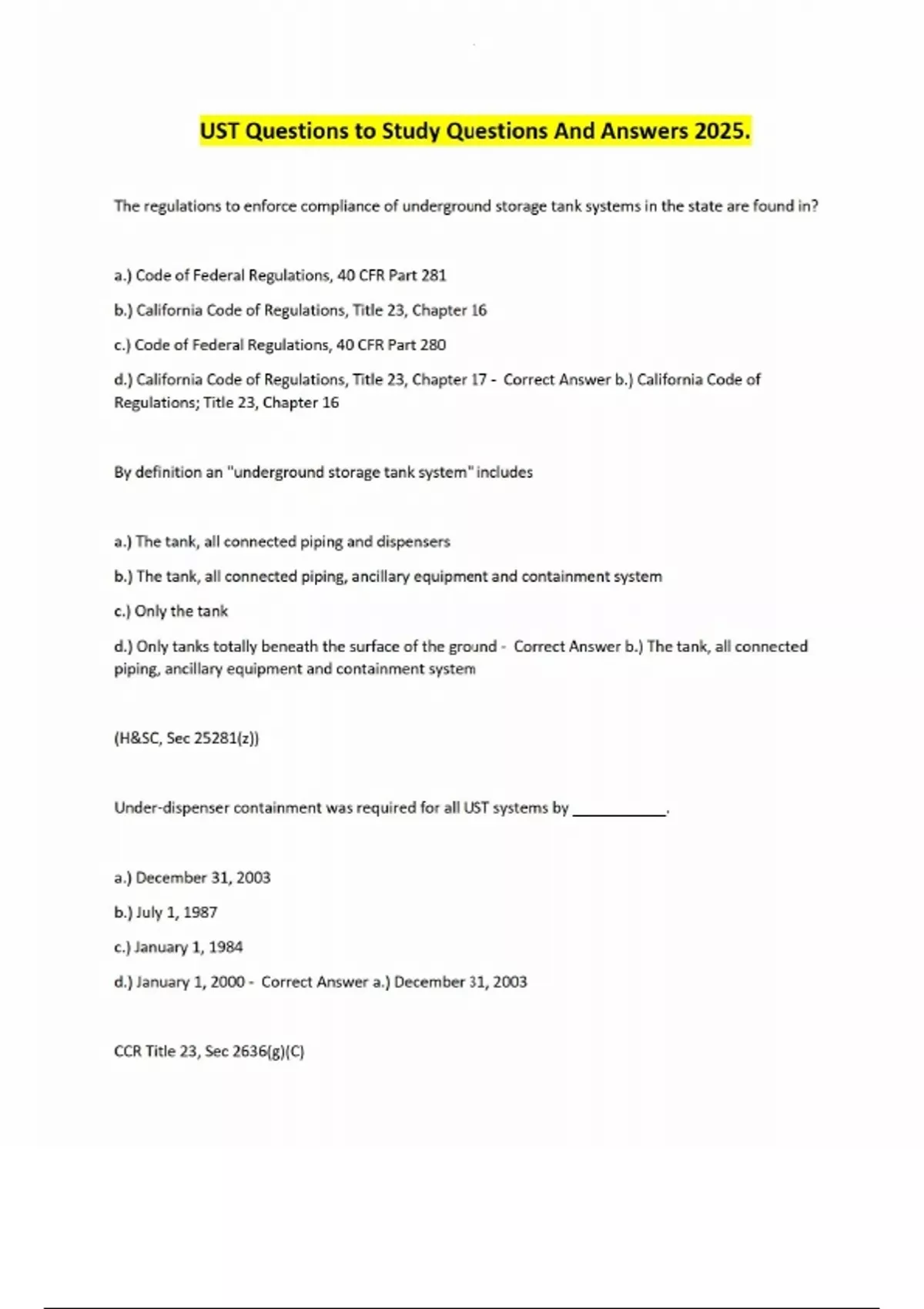 UST Questions to Study Questions And Answers 2025. The regulations to enforce compliance of underground storage tank systems in the state are found in? a.) Code of Federal Regulations, 40 CFR Part 281 b.) California Code of Regulations, Title 23, Chapter 16 c.) Code of Federal Regulations, 40 CFR Part 280 d.) California Code of Regulations, Title 23, Chapter 17 - Correct Answer b.) California Code of Regulations; Title 23, Chapter 16 By definition an "underground storage tank system" includes a.) The tank, all connected piping and dispensers b.) The tank, all connected piping, ancillary equipment and containment system c.) Only the tank d.) Only tanks totally beneath the surface of the ground - Correct Answer b.) The tank, all connected piping, ancillary equipment and containment system (H&SC, Sec 25281(z)) Under-dispenser containment was required for all UST systems by ___________. a.) December 31, 2003 b.) July 1, 1987 c.) January 1, 1984 d.) January 1, 2000 - Correct Answer a.) December 31, 2003 CCR Title 23, Sec 2636(g)(C) According to California Law, UST systems installed after July 1, 2003, require a one-time ELD test to ensure that the tank is product tight... a.) If the tank is located within one (1) mile of a public drinking water well b.) If the tank is located within 1000 feet of a public drinking water well c.) Unless the tank is equipped with secondary containment d.) In all cases - Correct Answer For ALL tanks before use (H&SC 25290.2 (I)) d.) In all cases H&SC, Sec 25290.2(i) The written report submitted to the local agency after an unauthorized release is required to include the following except: a.) Description of actions taken to stop the release b.) Cause of the release