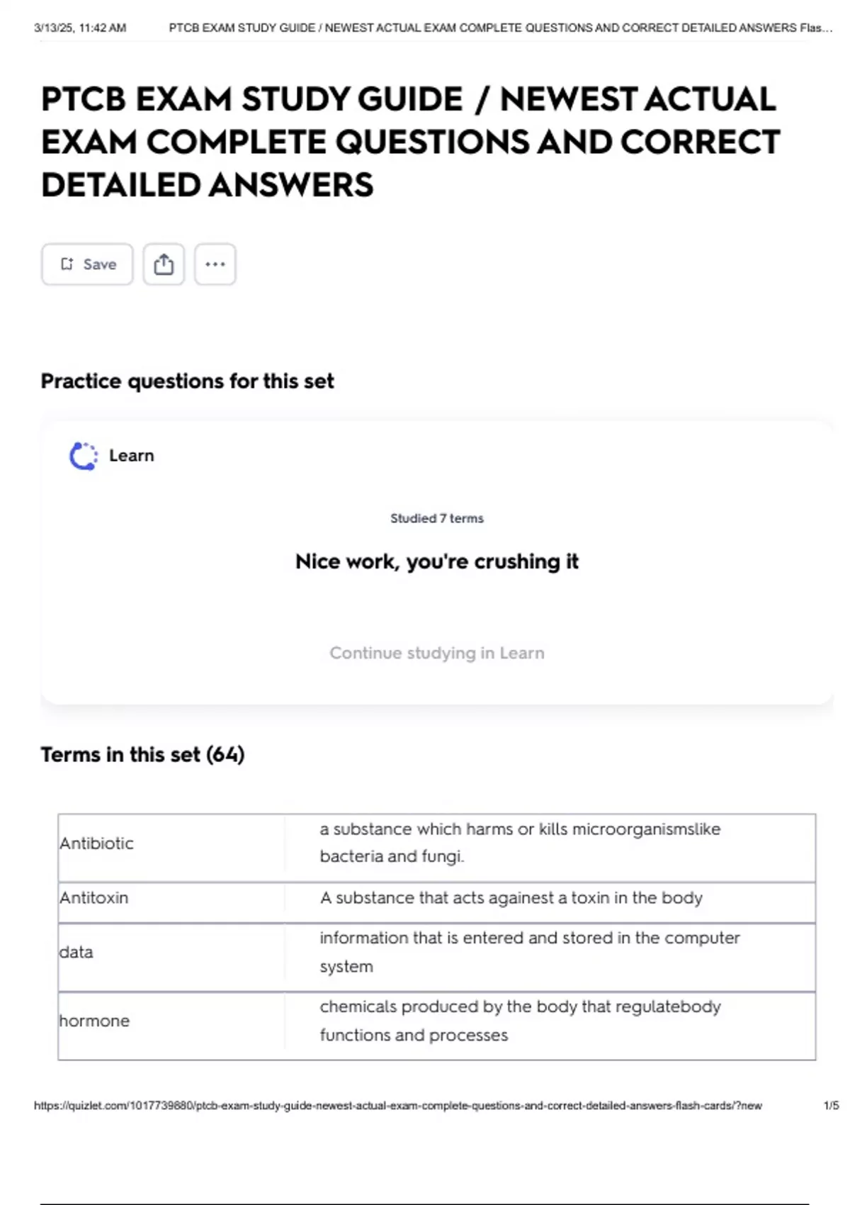 , 3/13/25, 11:42 AM PTCB EXAM STUDY GUIDE / NEWEST ACTUAL EXAM COMPLETE QUESTIONS AND CORRECT DETAILED ANSWERS Flas…