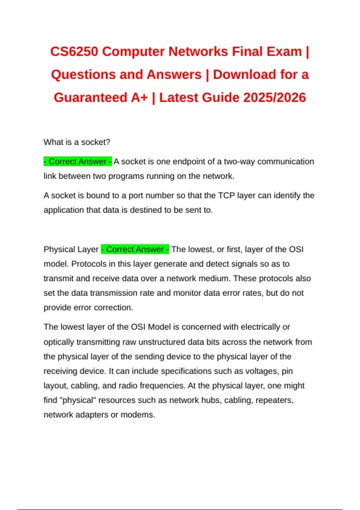 CS6250 Computer Networks Final Exam | Questions and Answers | Download for a Guaranteed A+ | Latest Guide 2025/2026 CS6250 Computer Networks Final Exam | Questions and Answers | Download for a Guaranteed A+ | Latest Guide 2025/2026