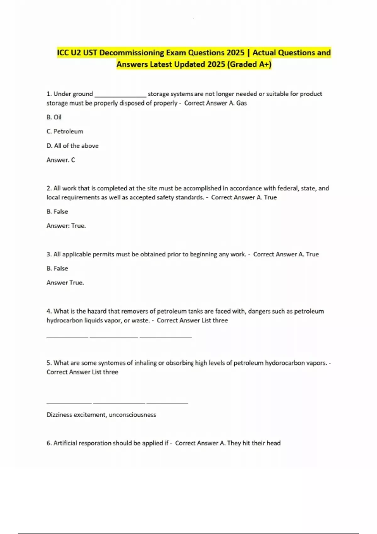 ICC U2 UST Decommissioning Exam Questions 2025 | Actual Questions and Answers Latest Updated 2025 (Graded A+) 1. Under ground _______________ storage systems are not longer needed or suitable for product storage must be properly disposed of properly - Correct Answer A. Gas B. Oil C. Petroleum D. All of the above Answer. C 2. All work that is completed at the site must be accomplished in accordance with federal, state, and local requirements as well as accepted safety standards. - Correct Answer A. True B. False Answer: True. 3. All applicable permits must be obtained prior to beginning any work. - Correct Answer A. True B. False Answer True. 4. What is the hazard that removers of petroleum tanks are faced with, dangers such as petroleum hydrocarbon liquids vapor, or waste. - Correct Answer List three ____________ ______________ _______________ 5. What are some syntomes of inhaling or obsorbing high levels of petroleum hydorocarbon vapors. - Correct Answer List three _____________ _______________ ____________ Dizziness excitement, unconsciousness 6. Artificial resporation should be applied if - Correct Answer A. They hit their head B. They cant see C. They have stopped breathing D. They suffer from cardiac arrest AnswerC 7. What are three parts of the body should Petroleum liquids be kept away from an example would be eyes, skin and moulth. - Correct Answer List three _____________ _________________ ______________ 8. Hiogh ocupational exposures to benezene have been associated with various human blood disorders - Correct Answer True/False AnswerTrue 9. Smoking matterials or any flamable materials must be reamoved from the job site in order to prevent - Correct Answer A. People from smoking B. Sudden compution C. Second hand smoke D. Exploshins indide of tanks due to large amounts of vapor E. B and D Answer E 10. What tool with the abbreviation CGI should be used to check for hazardous vapor concentrations. - Correct Answer _____________________________________ Answer: Combustible gas indicator 11. All tools that are in areas with hazardous vapor concentartions should be shut down or they should be ________________ proof. - Correct Answer __________________ answer Explosion