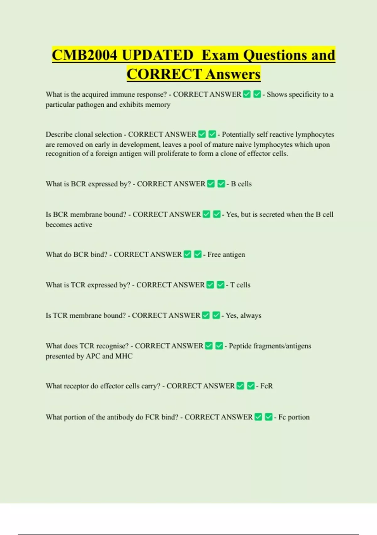 CMB2004 UPDATED Exam Questions and CORRECT Answers What is the acquired immune response? - CORRECT ANSWER particular pathogen and exhibits memory Describe clonal selection - CORRECT ANSWER - Shows specificity to a - Potentially self reactive lymphocytes are removed on early in development, leaves a pool of mature naive lymphocytes which upon recognition of a foreign antigen will proliferate to form a clone of effector cells