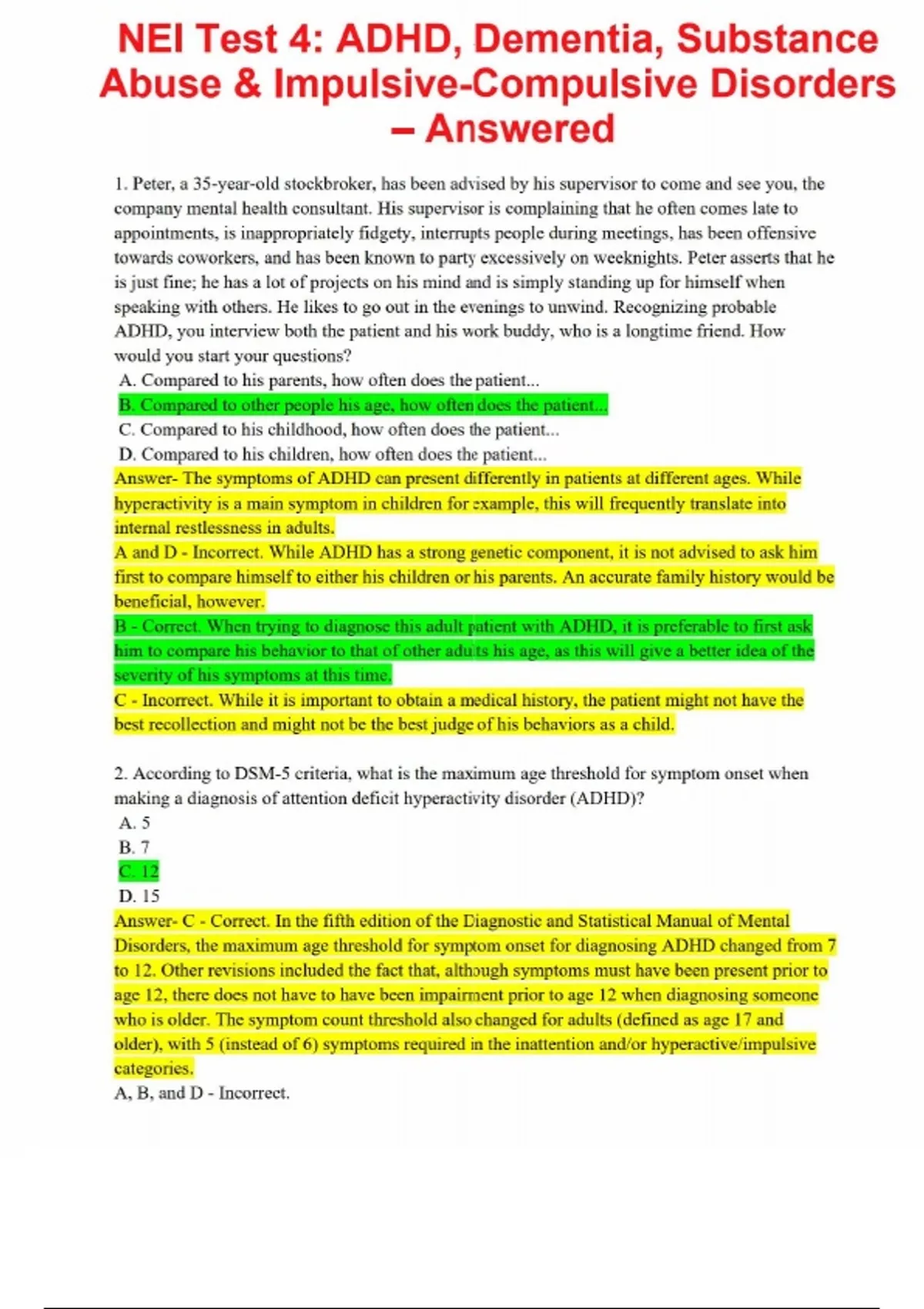 NEI Test 4: ADHD, Dementia, Substance Abuse & Impulsive-Compulsive Disorders – Answered