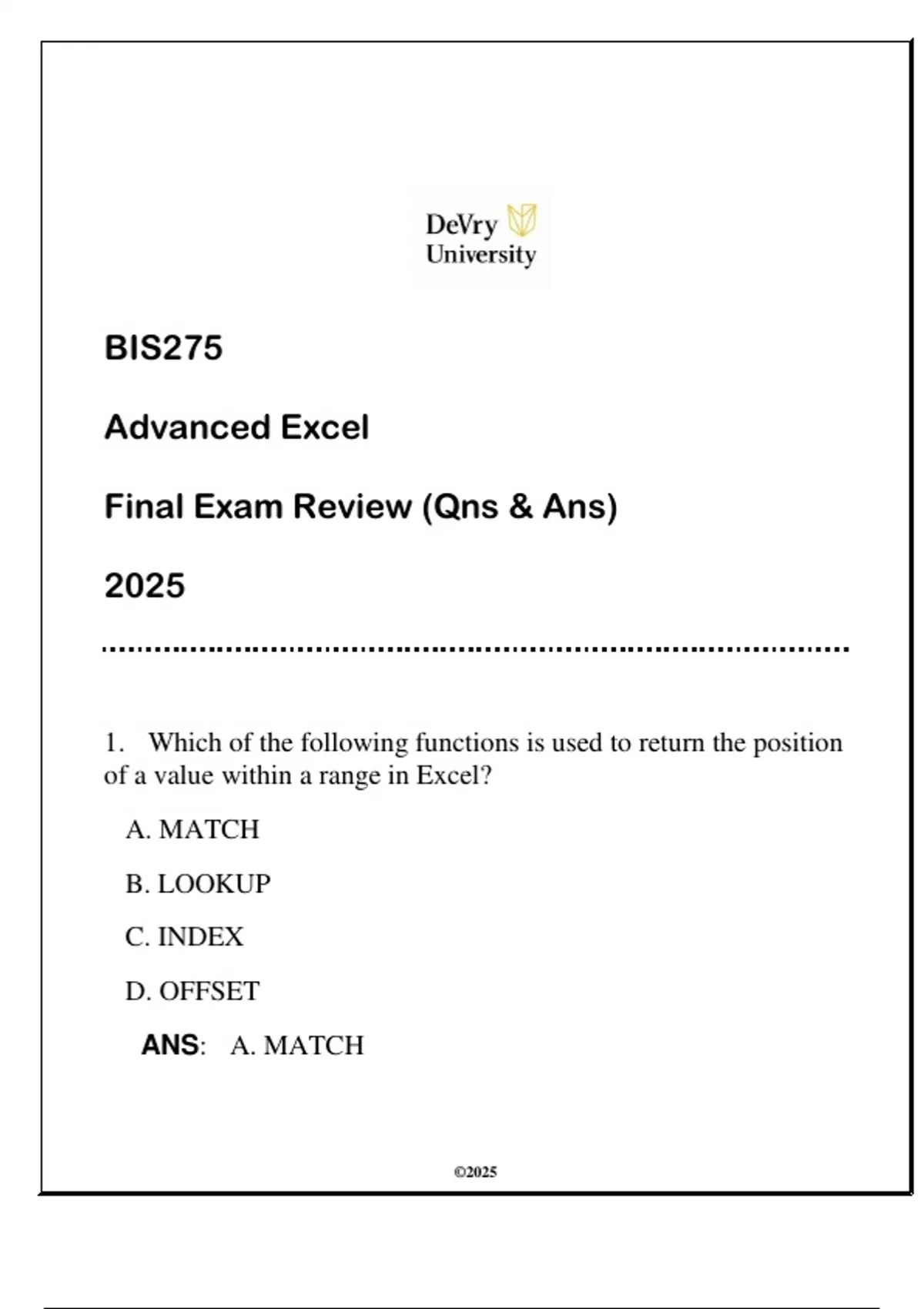 BIS275 Advanced Excel (DeVry) Final Exam Review 2025 (Qns & Ans