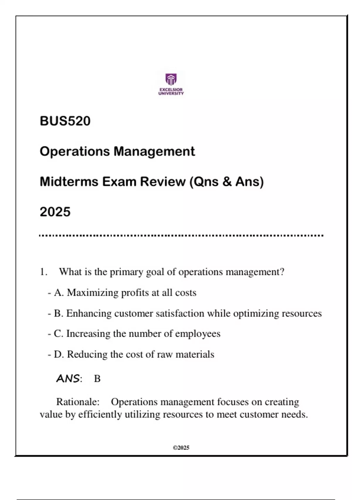 BUS520 Operations Management (EU) Midterms Exam Review 2025 (Qns & Ans)