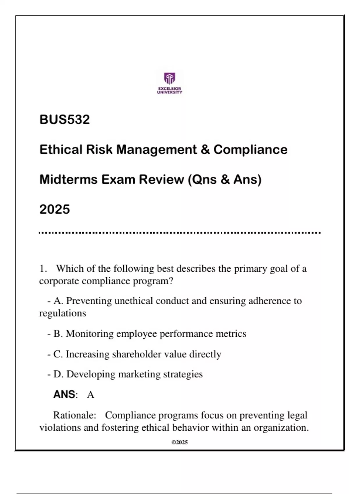 BUS532 Ethical Risk Mgt & Compliance (EU) Midterms Exam Review 2025 (Qns & AnsBUS532 Ethical Risk Mgt & Compliance (EU) Midterms Exam Review 2025 (Qns & AnsBUS532 Ethical Risk Mgt & Compliance (EU) Midterms Exam Review 2025 (Qns & Ans