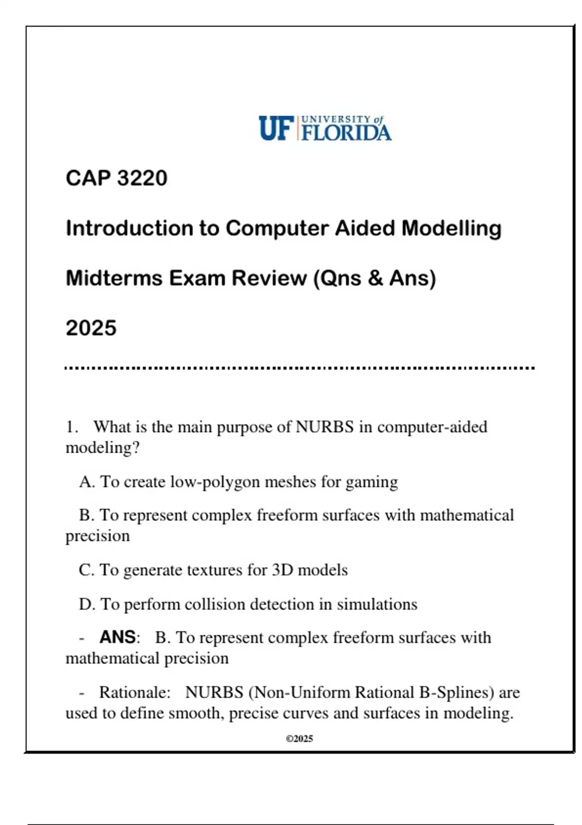 CAP 3220 Intro to Computer Aided Modelling (UF) Midterms Exam Review 2025 (Qns & AnsCAP 3220 Intro to Computer Aided Modelling (UF) Midterms Exam Review 2025 (Qns & AnsCAP 3220 Intro to Computer Aided Modelling (UF) Midterms Exam Review 2025 (Qns & AnsCAP 3220 Intro to Computer Aided Modelling (UF) Midterms Exam Review 2025 (Qns & Ans