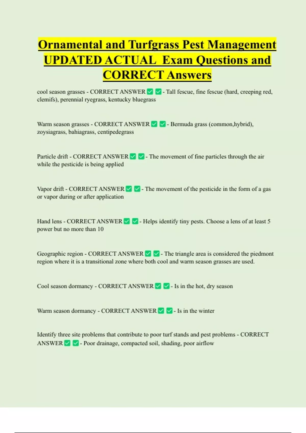 cool season grasses - CORRECT ANSWER - Tall fescue, fine fescue (hard, creeping red,