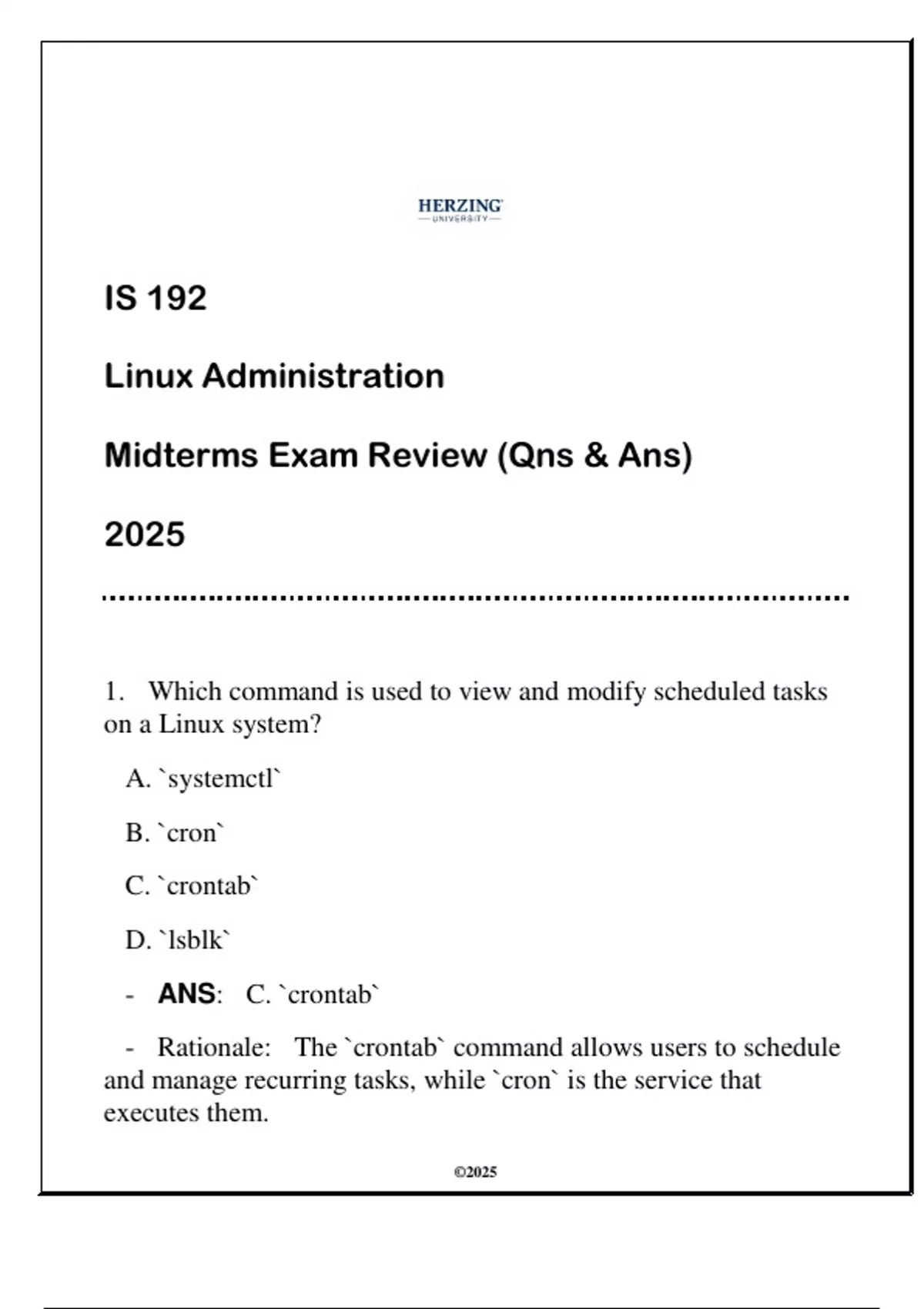 IS 192 Linux Administration (HU) Midterms Exam Review 2025 (Qns & Ans)