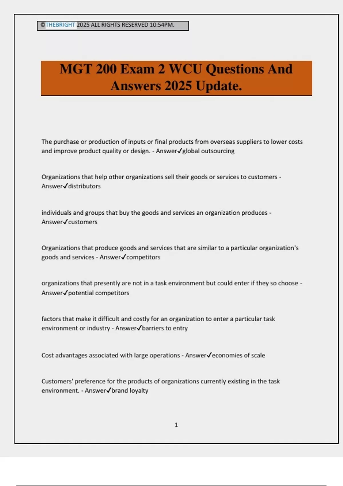 ©THEBRIGHT 2025 ALL RIGHTS RESERVED 10:54PM. 1 MGT 200 Exam 2 WCU Questions And Answers 2025 Update. The purchase or production of inputs or final products from overseas suppliers to lower costs and improve product quality or design. - Answerglobal outsourcing Organizations that help other organizations sell their goods or services to customers - Answerdistributors individuals and groups that buy the goods and services an organization produces - Answercustomers Organizations that produce goods and services that are similar to a particular organization's goods and services - Answercompetitors organizations that presently are not in a task environment but could enter if they so choose - Answerpotential competitors factors that make it difficult and costly for an organization to enter a particular task environment or industry - Answerbarriers to entry Cost advantages associated with large operations - Answereconomies of scale Customers' preference for the products of organizations currently existing in the task environment. - Answerbrand loyalty ©THEBRIGHT 2025 ALL RIGHTS RESERVED 10:54PM. 2 Interest rates, inflation, unemployment, economic growth, and other factors that affect the general health and well-being of a nation or the regional economy of an organization. - AnswerEconomic Forces Knowledge that people use to make a way of life in their surroundings - AnswerTechnology Outcomes of changes in the technology that managers use to design, produce, or distribute goods and services - AnswerTechnological Forces Pressures emanating from the social structure of a country or society or from the national culture - Answersociocultural forces the tradition system of relationships established between people and groups in a society. - Answersocial structure the set of values that a society considers important and the norms of behavior that are approved or sanctioned in that society - Answernational culture Outcomes of changes in, or changing attitudes toward, the characteristics of a population, such as age, gender, ethnic origin, race, sexual orientation, and social class. - Answerdemographic forces Outcomes of changes in laws and regulations, such as deregulation of industries, privatization of organizations, and increased emphasis on environmental protection. - Answerpolitical and legal forces Actions or processes that involve the entire world and result in making something worldwide in scope. - AnswerGlobalization a tax that a government places on c