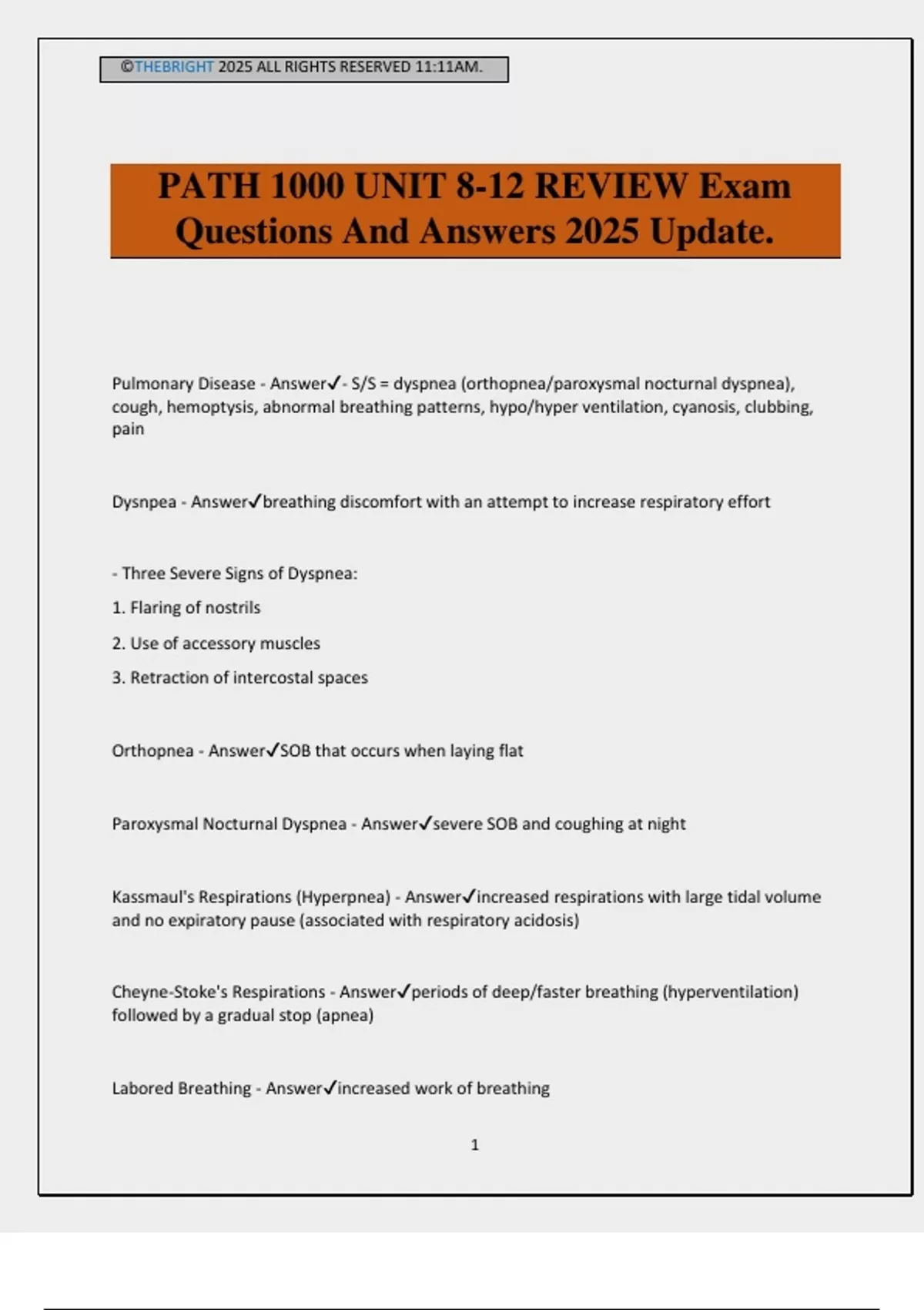 ©THEBRIGHT 2025 ALL RIGHTS RESERVED 11:11AM. 1 PATH 1000 UNIT 8-12 REVIEW Exam Questions And Answers 2025 Update. Pulmonary Disease - Answer- S/S = dyspnea (orthopnea/paroxysmal nocturnal dyspnea), cough, hemoptysis, abnormal breathing patterns, hypo/hyper ventilation, cyanosis, clubbing, pain Dysnpea - Answerbreathing discomfort with an attempt to increase respiratory effort - Three Severe Signs of Dyspnea: 1. Flaring of nostrils 2. Use of accessory muscles 3. Retraction of intercostal spaces Orthopnea - AnswerSOB that occurs when laying flat Paroxysmal Nocturnal Dyspnea - Answersevere SOB and coughing at night Kassmaul's Respirations (Hyperpnea) - Answerincreased respirations with large tidal volume and no expiratory pause (associated with respiratory acidosis) Cheyne-Stoke's Respirations - Answerperiods of deep/faster breathing (hyperventilation) followed by a gradual stop (apnea) Labored Breathing - Answerincreased work of breathing ©THEBRIGHT 2025 ALL RIGHTS RESERVED 11:11AM. 2 - Occurs with obstructed airways - Stridor or wheezing Restricted Breathing - Answerprevent lung from fully expanding with air due to stiffen lungs/chest wall - Tachypnea and small tidal volumes What is the goal of ventilation? - Answer- Maintain an optimal pH through release of CO2 - Hypoventilation à hypercapnia à acidosis - Hyperventilation à hypocapnia à alkalosis Hypoxemia - Answerdecreased oxygen of arterial blood presenting as central cyanosis - Impairs alveolocapillary membrane diffusion - Causes: · Decreased inspired O2 (high altitude) · Hypoventilation from lack of neurological stimulation (drug overdose) · Respiratory diseases (COPD) · Pulmonary edema & fibrosis Hypoxia - Answerdecreased oxygen in cells of tissues presenting as peripheral cyanosis Respiratory Failure - Answerinadequate gas exchange resulting in low O2/pH and high CO2 - Causes can be direct or indirect injury ©THEBRIGHT 2025 ALL RIGHTS RESERVED 11:11AM. 3 Restrictive Disorders - Answerdecreased lung compliance requiring more effort to expand lungs during inspiration resulting of V/Q mismatch - hypoxemia Aspiration - Answerfood or fluid in the right lower lobe of the lungs - Clinical Manifestations: · Sudden onset of choking · Coughing with/without vomiting · Dyspnea · Wheezing Bronchiectasis - Answerpersistent abnormal dilation of the bronchi associated with bronchial inflammation - Chronic inflammation causes destruction of bronchial walls & permanent dilation - Airway damage leads to bronchospasms & increased purulent mucous - Hemoptysis, clubbing of fingers and cor pulmonale occurs Bronchiolitis - Answerdiffuse inflammatory obstruction of bronchioles - Common in children - Linked to a viral infection of upper/lower airways (adults) - S/S = increased respirations, use of accessory muscles, fever, dry non-productive cough - Can lead to a hyper-inflated chest and hypoxemia Atelectasis - Answercollapse of lung tissue (alveoli) which affects gas exchange - S/S = dyspnea, cough, fever, leukocytosis - Compression - external pressure on lungs from tumors, fluid, air or abdominal distention - Absorption - removal of air from obstructed/hypoventilation alveoli or from inhalation of anesthetics/concentrate