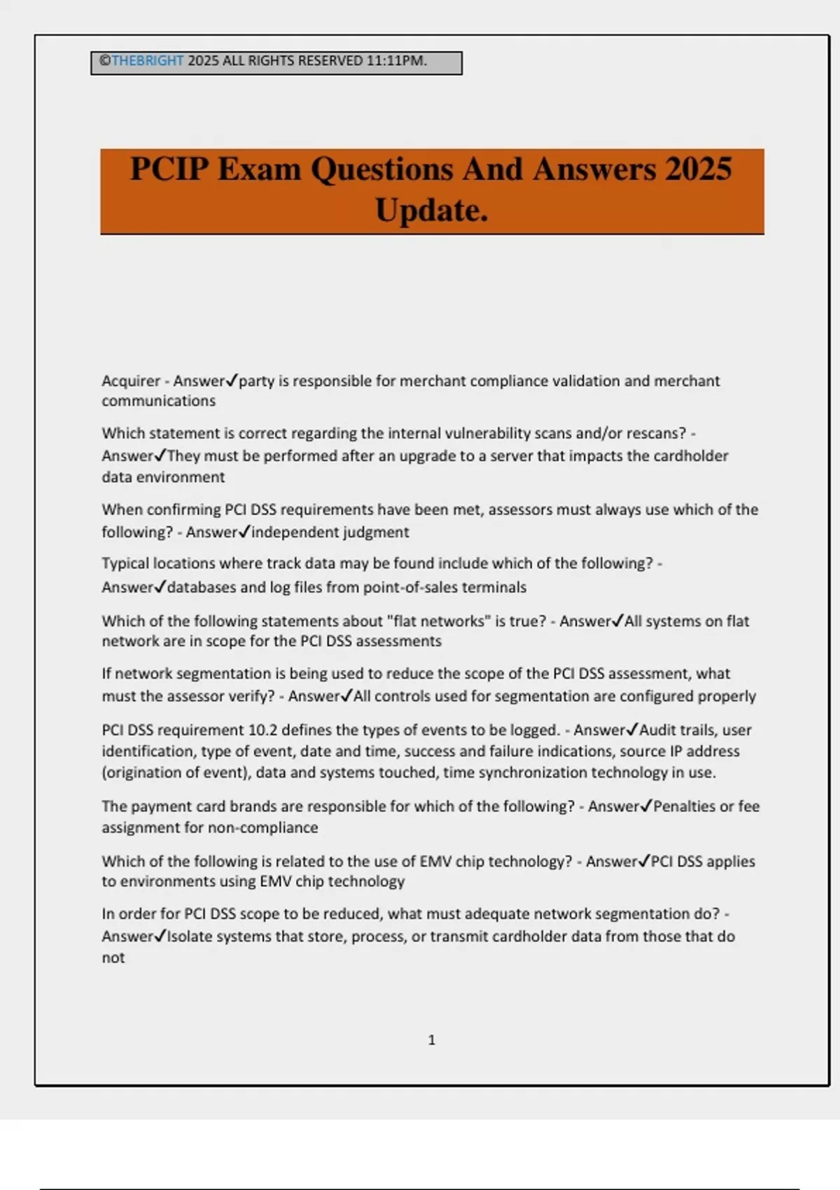 ©THEBRIGHT 2025 ALL RIGHTS RESERVED 11:11PM. 1 PCIP Exam Questions And Answers 2025 Update. Acquirer - Answerparty is responsible for merchant compliance validation and merchant communications Which statement is correct regarding the internal vulnerability scans and/or rescans? - AnswerThey must be performed after an upgrade to a server that impacts the cardholder data environment When confirming PCI DSS requirements have been met, assessors must always use which of the following? - Answerindependent judgment Typical locations where track data may be found include which of the following? - Answerdatabases and log files from point-of-sales terminals Which of the following statements about "flat networks" is true? - AnswerAll systems on flat network are in scope for the PCI DSS assessments If network segmentation is being used to reduce the scope of the PCI DSS assessment, what must the assessor verify? - AnswerAll controls used for segmentation are configured properly PCI DSS requirement 10.2 defines the types of events to be logged. - AnswerAudit trails, user identification, type of event, date and time, success and failure indications, source IP address (origination of event), data and systems touched, time synchronization technology in use. The payment card brands are responsible for which of the following? - AnswerPenalties or fee assignment for non-compliance Which of the following is related to the use of EMV chip technology? - AnswerPCI DSS applies to environments using EMV chip technology In order for PCI DSS scope to be reduced, what must adequate network segmentation do? - AnswerIsolate systems that store, process, or transmit cardholder data from those that do not ©THEBRIGHT 2025 ALL RIGHTS RESERVED 11:11PM. 2 The Mod 10 formula doubles the value of every other digit of the primary account number beginning with which digit? - AnswerSecond from the right What is the Mod 10 or Luhn formula? - AnswerThe algorithm used to validate PAN (primary account numbers) What is required regarding the entity sharing cardholder data with a service provider? - AnswerThe entity must have an established process of engaging service provider, including proper due diligence prior to engagement Who is responsible for setting compliance deadlines and fines? - AnswerPayment brands In accordance with the requirement 12.3.8, usage policies must be defined to automatically disconnect remote-access sessions. When should the remote-access sessions be disconnected? - AnswerAfter a specific period if inactivity the following statements is correct regarding a PA-DSS application? - AnswerPA-DSS compliant payment applications are in scope for the merchant's PCI DSS assessment What does it mean if a suspected card number passes Mod 10? - AnswerIt is definitely a valid PAN Which of the following is correct related to the tracks of the data on the magnetic stripe of a payment card? - AnswerTrack 1 contains all the field of both Track 1 and Track 2 Which of the following is a responsibility of the PCI SSC? - AnswerDefine validation requirements of ASVs (Approved scanning vendors When should penetration testing be performed? - AnswerAt least annually, and after any significant changes to infrastructure or applications How often are risk assessments required? - AnswerAt least annually This statement about the transaction process is true - AnswerThe card holder receives the type of payment, the card, and the bills from the issuers Which of the following statements accurately describes the service providers? - AnswerA service provider processes, stores, or transmits card holder's data on the behalf of another entity A service provider with no electric cardholder data storage may be eligible to complete the SAQ? - AnswerSAQ B SAQ A - AnswerIf your organization only accepts card-not-present transactions (e-commerce or phone/mail order) If the processing of ca