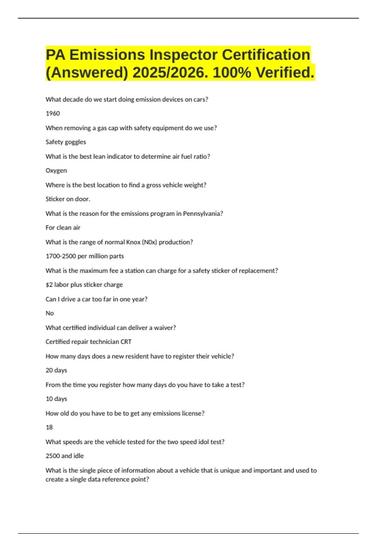 PA Emissions Inspector Certification (Answered) 2025/2026. 100% Verified. What decade do we start doing emission devices on cars? 1960 When removing a gas cap with safety equipment do we use? Safety goggles What is the best lean indicator to determine air fuel ratio? Oxygen Where is the best location to find a gross vehicle weight? Sticker on door. What is the reason for the emissions program in Pennsylvania? For clean air What is the range of normal Knox (N0x) production? per million parts What is the maximum fee a station can charge for a safety sticker of replacement? $2 labor plus sticker charge Can I drive a car too far in one year? No