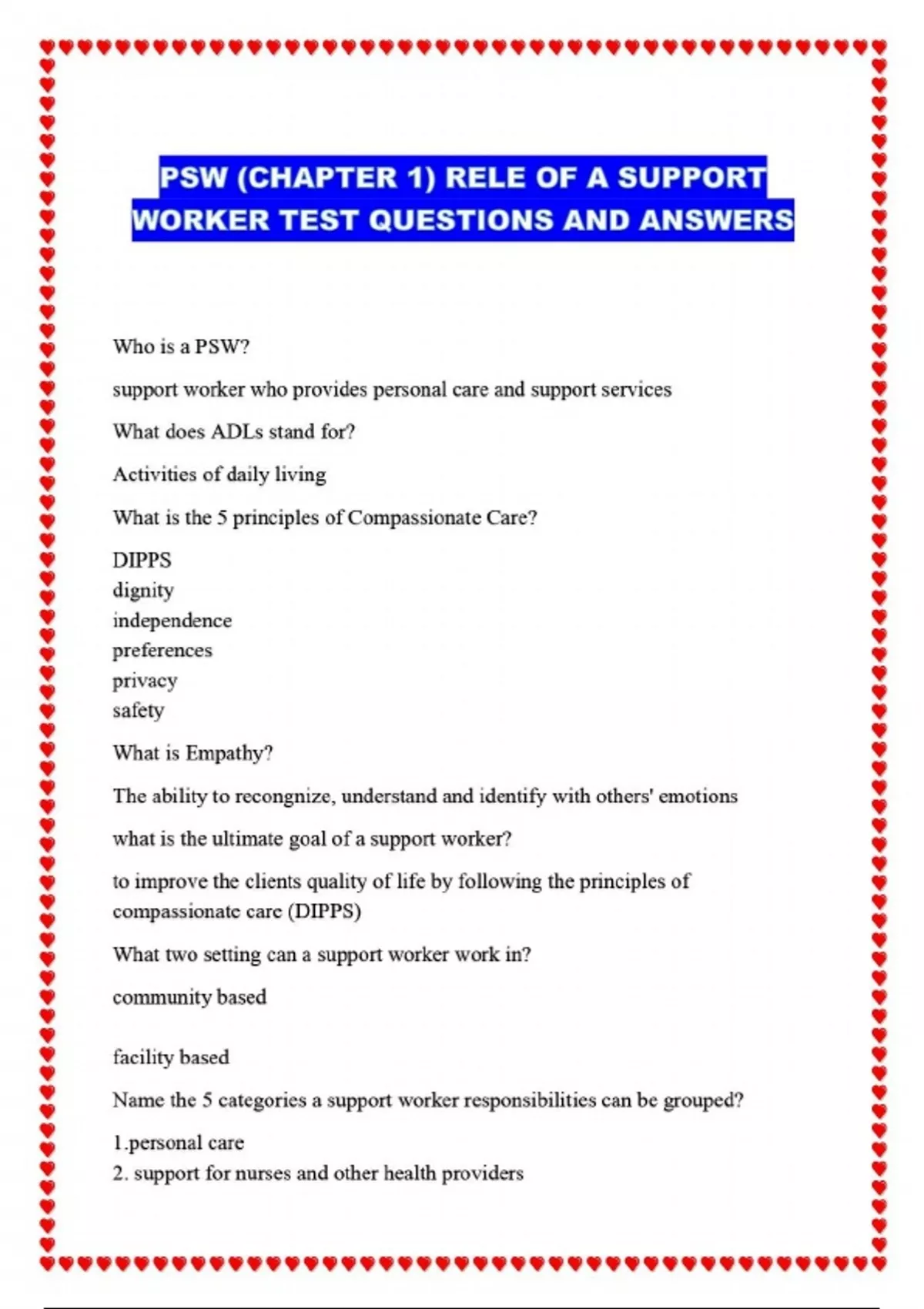 PSW (CHAPTER 1) RELE OF A SUPPORT WORKER TEST QUESTIONS AND ANSWERS....
