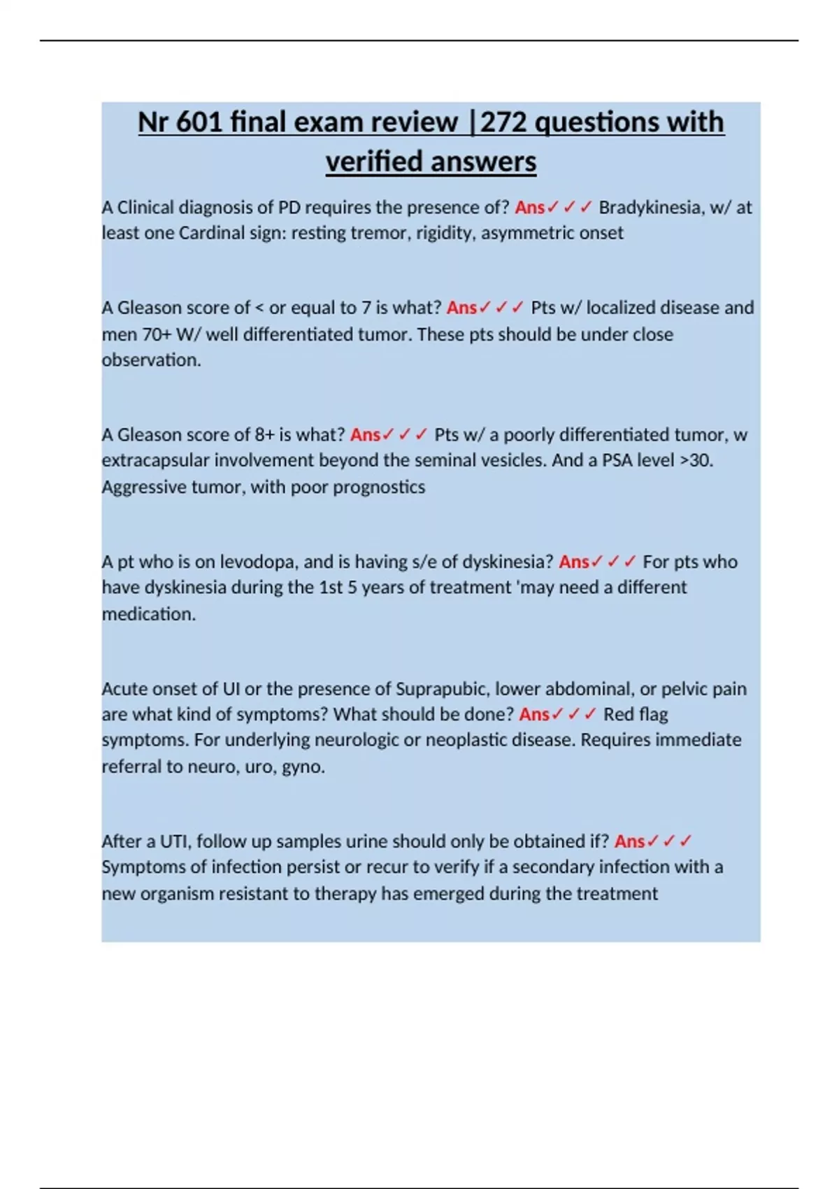 A Clinical diagnosis of PD requires the presence of? Ans Bradykinesia, w/ at least one Cardinal sign: resting tremor, rigidity, asymmetric onset A Gleason score of < or equal to 7 is what? Ans Pts w/ localized disease and men 70+ W/ well differentiated tumor. These pts should be under close observation. A Gleason score of 8+ is what? Ans Pts w/ a poorly differentiated tumor, w extracapsular involvement beyond the seminal vesicles. And a PSA level >30. Aggressive tumor, with poor prognostics A pt who is on levodopa, and is having s/e of dyskinesia? Ans For pts who have dyskinesia during the 1st 5 years of treatment 'may need a different medication. Acute onset of UI or the presence of Suprapubic, lower abdominal, or pelvic pain are what kind of symptoms? What should be done? Ans Red flag symptoms. For underlying neurologic or neoplastic disease. Requires immediate referral to neuro, uro, gyno. After a UTI, follow up samples urine should only be obtained if? Ans Symptoms of infection persist or recur to verify if a secondary infection with a new organism resistant to therapy has emerg
