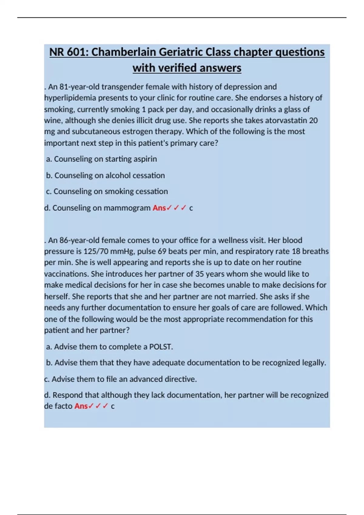 1. A 69-year-old female presents to your office for routine primary care. Her elder