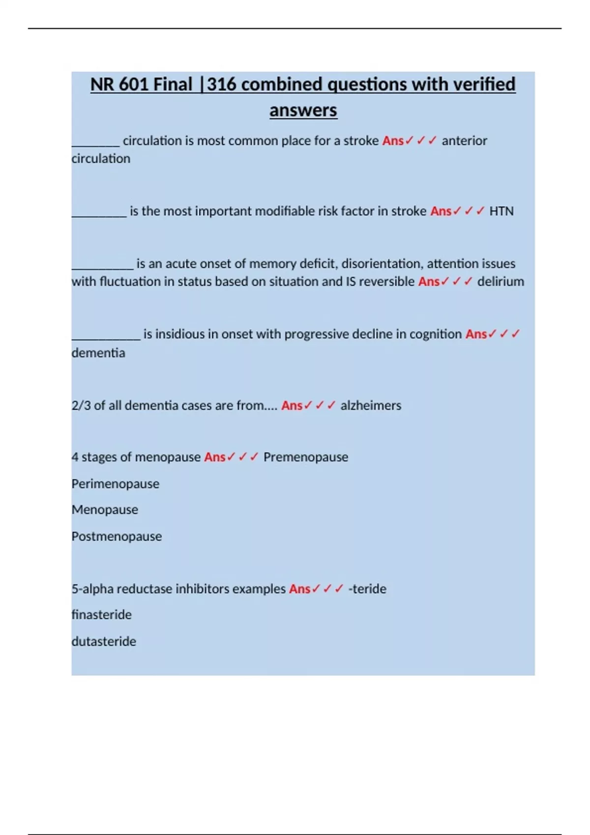_______ circulation is most common place for a stroke Ans anterior circulation ________ is the most important modifiable risk factor in stroke Ans HTN _________ is an acute onset of memory deficit, disorientation, attention issues with fluctuation in status based on situation and IS reversible Ans delirium __________ is insidious in onset with progressive decline in cognition Ans dementia 2/3 of all dementia cases are from.... Ans alzheimers 4 stages of menopause Ans Premenopause Perimenopause Menopause Postmenopause 5-alpha reductase inhibitors examples Ans -teride finasteride dutasteride