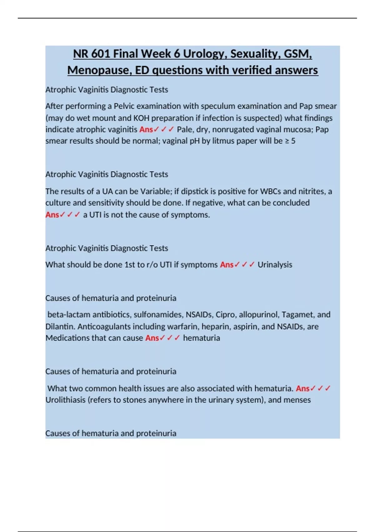 Atrophic Vaginitis Diagnostic Tests After performing a Pelvic examination with speculum examination and Pap smear (may do wet mount and KOH preparation if infection is suspected) what findings indicate atrophic vaginitis Ans Pale, dry, nonrugated vaginal mucosa; Pap smear results should be normal; vaginal pH by litmus paper will be ≥ 5 Atrophic Vaginitis Diagnostic Tests The results of a UA can be Variable; if dipstick is positive for WBCs and nitrites, a culture and sensitivity should be done. If negative, what can be concluded Ans a UTI is not the cause of symptoms. Atrophic Vaginitis Diagnostic Tests What should be done 1st to r/o UTI if symptoms Ans Urinalysis Causes of hematuria and proteinuria beta-lactam antibiotics, sulfonamides, NSAIDs, Cipro, allopurinol, Tagamet, and Dilantin. Anticoagulants including warfarin, heparin, aspirin, and NSAIDs, are Medications that can cause Ans hematuria Causes of hematuria and proteinuria What two common health issues are also associated with hematuria. Ans Urolithiasis (refers to stones anywhere in the urinary system), and menses