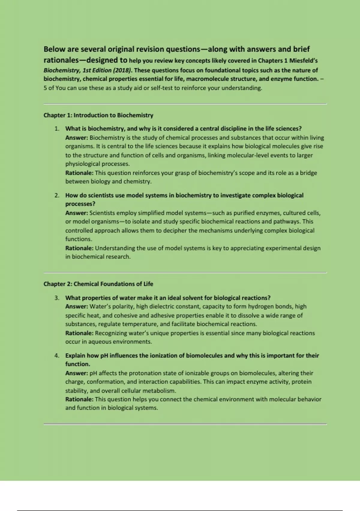 topics from Chapters 1–5 of Miesfeld’s Biochemistry, 1st Edition (2018). These questions can help