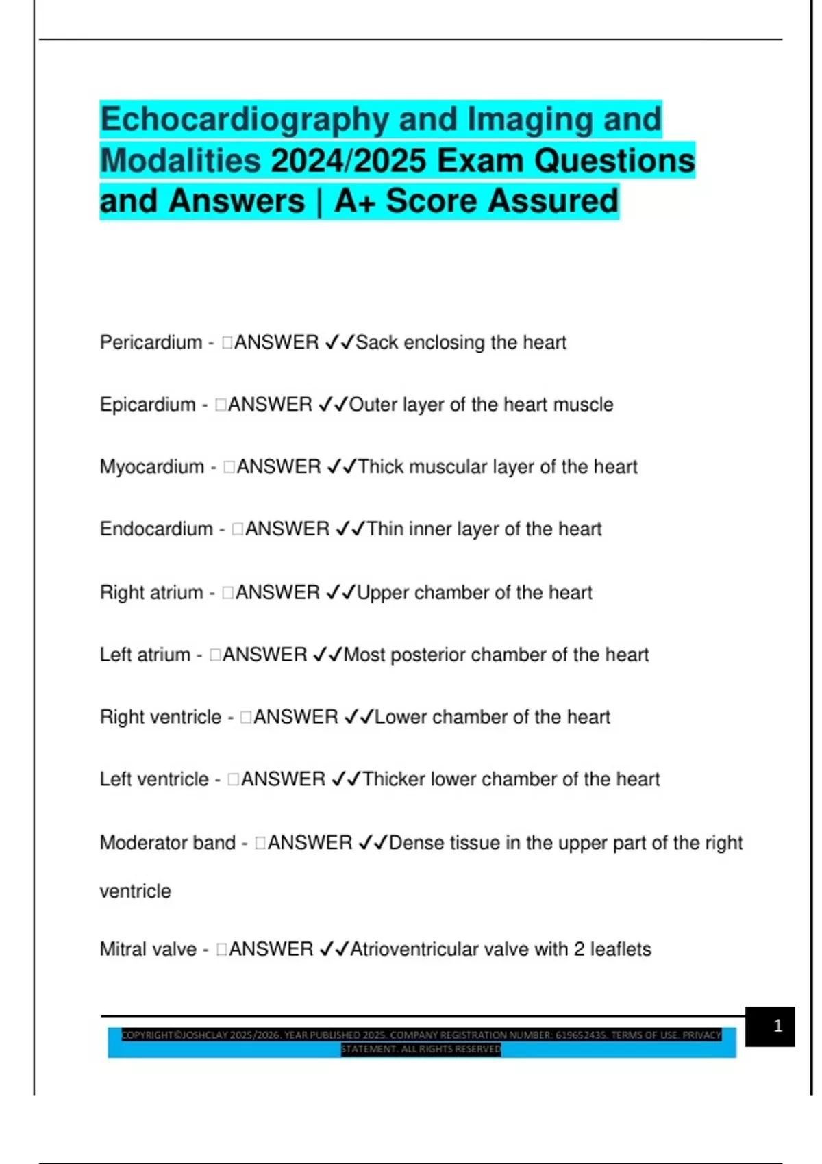 Epicardium - 🧠ANSWER ✔✔Outer layer of the heart muscle