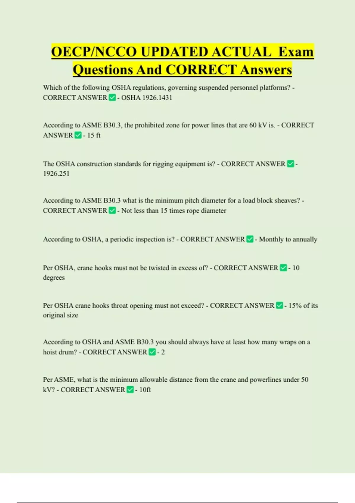 OECP/NCCO UPDATED ACTUAL Exam Questions And CORRECT Answers Which of the following OSHA regulations, governing suspended personnel platforms? - CORRECT ANSWER - OSHA 1926.1431 According to ASME B30.3, the prohibited zone for power lines that are 60 kV is. - CORRECT ANSWER - 15 ft The OSHA construction standards for rigging equipment is? - CORRECT ANSWER - 1926.251