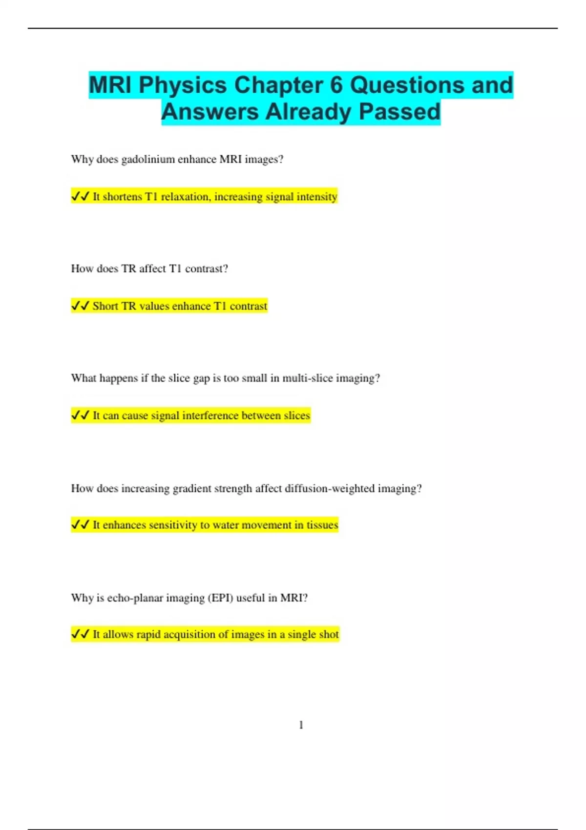 MRI Physics Chapter 6 Questions and Answers Already Passed Why does gadolinium enhance MRI images? It shortens T1 relaxation, increasing signal intensity How does TR affect T1 contrast? Short TR values enhance T1 contrast What happens if the slice gap is too small in multi-slice imaging? It can cause signal interference between slices How does increasing gradient strength affect diffusion-weighted imaging? It enhances sensitivity to water movement in tissues Why is echo-planar imaging (EPI) useful in MRI? It allows rapid acquisition of images in a single shot 2 What is the effect of using a longer TE in T2-weighted imaging? It increases T2 contrast but decreases overall signal How does a spin-echo sequence correct for dephasing? By using a 180-degree refocusing pulse Why is spatial resolution important in MRI? It determines the level of detail in the final image What is the significance of phase encoding? It assigns spatial location to signals in an image How does field of view (FOV) affect resolution? A larger FOV lowers resolution but captures more anatomy Why are ultra-short TE sequences used in MRI? To capture signals from tissues with very short T2 times 3 What is the primary function of a time-of-flight (TOF) sequence? To enhance visualization of blood flow without contrast What is the primary function of RF coils in MRI? To transmit and receive radiofrequency signals How does increasing TR affect image contrast? It reduces T1 contrast and increases scan time What happens when TE is increased in a spin-echo sequence? It enhances T2 contrast but reduces SNR Why is T2* decay faster than T2 decay?
