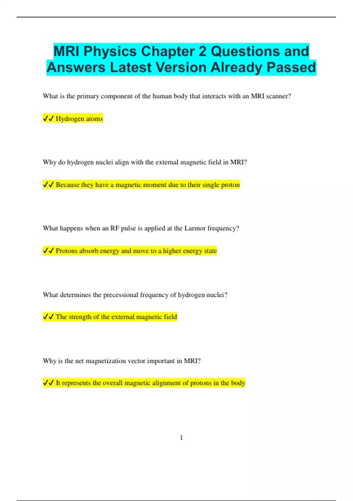 MRI Physics Chapter 2 Questions and Answers Latest Version Already Passed What is the primary component of the human body that interacts with an MRI scanner? Hydrogen atoms Why do hydrogen nuclei align with the external magnetic field in MRI? Because they have a magnetic moment due to their single proton What happens when an RF pulse is applied at the Larmor frequency? Protons absorb energy and move to a higher energy state What determines the precessional frequency of hydrogen nuclei? The strength of the external magnetic field Why is the net magnetization vector important in MRI? It represents the overall magnetic alignment of protons in the body 2 What happens to protons when the RF pulse is turned off? They relax back to their original alignment with the magnetic field Why does T1 relaxation occur? Energy is transferred from protons to the surrounding lattice What is another term for T2 relaxation? Transverse relaxation Why does T2 relaxation lead to signal loss? Protons lose phase coherence and dephase over time How does the external magnetic field affect proton behavior? It causes them to align and precess at a specific frequency What is the unit of measurement for the magnetic field strength in MRI? Tesla (T) 3 Why is the Larmor equation important in MRI? It defines the precessional frequency of hydrogen nuclei How does an increase in magnetic field strength affect the Larmor frequency? It increases the precessional frequency What is the role of the RF coil in MRI? It transmits and receives radiofrequency signals Why do different tissues have different relaxation times? Due to variations in molecular composition and interaction with water What is the relationship between T1 and TR in MRI imaging? TR must be long enough to allow sufficient T1 recovery Why does T2 decay occur more rapidly than T1 recovery? T2 relaxation involves loss of phase coherence, which happens faster than energy transfer 4 How does T1 relaxation time differ between fat and water? Fat has a shorter T1 relaxation time than water Why does MRI rely on hydrogen rather than other elements in the body? Hydrogen is abundant and has a strong magnetic moment What is the significance of equilibrium magnetization in MRI?