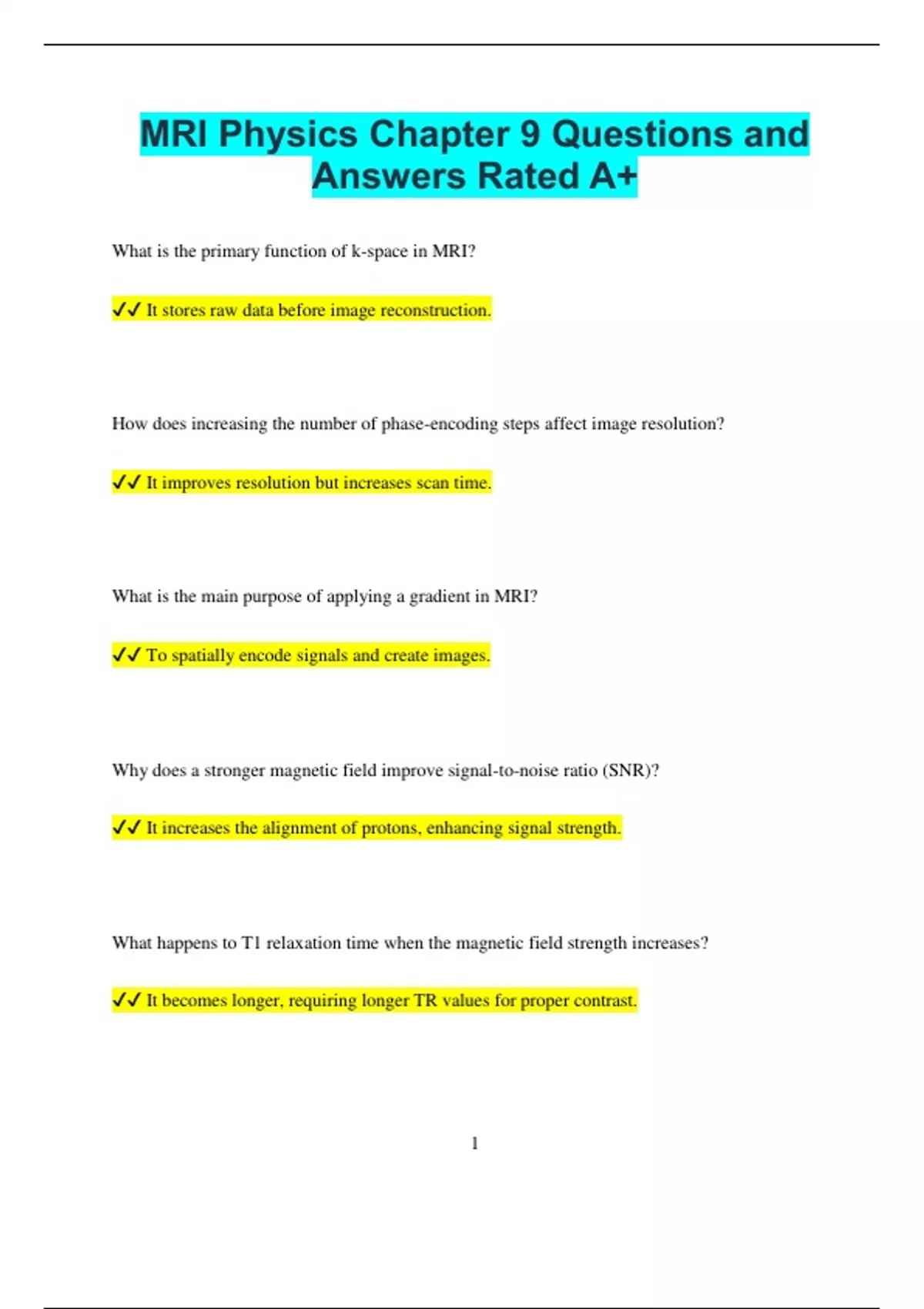 MRI Physics Chapter 9 Questions and Answers Rated A+ What is the primary function of k-space in MRI? It stores raw data before image reconstruction. How does increasing the number of phase-encoding steps affect image resolution? It improves resolution but increases scan time. What is the main purpose of applying a gradient in MRI? To spatially encode signals and create images. Why does a stronger magnetic field improve signal-to-noise ratio (SNR)? It increases the alignment of protons, enhancing signal strength. What happens to T1 relaxation time when the magnetic field strength increases? It becomes longer, requiring longer TR values for proper contrast. 2 Why is T2-weighted imaging useful for detecting pathology? It highlights fluid and edema, making abnormalities more visible. What is the purpose of the Fourier transform in MRI? It converts raw data from k-space into an image. How does decreasing slice thickness affect spatial resolution? It improves resolution but may reduce signal strength. What is the relationship between voxel size and image detail? Smaller voxels improve detail but require longer scan times. Why is gradient echo imaging more sensitive to magnetic field inhomogeneities? It does not use a 180-degree refocusing pulse, making it more susceptible to artifacts. How does increasing the echo time (TE) affect T2-weighted images? It enhances contrast between tissues with different T2 relaxation times. 3 What is the main advantage of parallel imaging techniques in MRI? They reduce scan times by acquiring fewer phase-encoding steps. Why does increasing the number of signal averages (NEX) improve image quality? It reduces noise by averaging multiple signals. How does a shorter TR (Repetition Time) affect T1-weighted images? It enhances T1 contrast but may reduce overall signal intensity. What effect does a longer TE have on image quality? It increases T2 weighting but can lead to more noise. Why is fat suppression used in MRI imaging? It removes fat signal to improve contrast and lesion detection. What is the role of RF pulses in MRI? They excite hydrogen protons and create measurable signals.