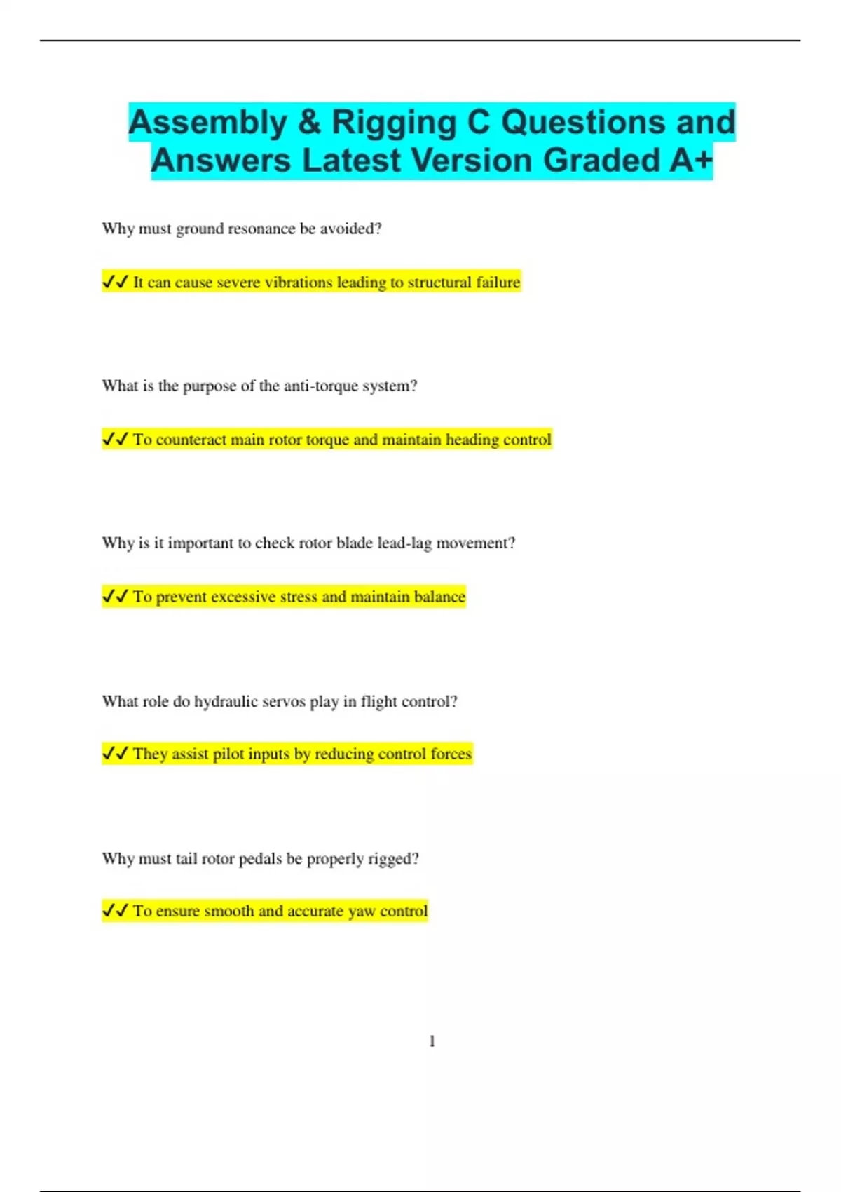 Assembly & Rigging C Questions and Answers Latest Version Graded A+ Why must ground resonance be avoided? It can cause severe vibrations leading to structural failure What is the purpose of the anti-torque system? To counteract main rotor torque and maintain heading control Why is it important to check rotor blade lead-lag movement? To prevent excessive stress and maintain balance What role do hydraulic servos play in flight control? They assist pilot inputs by reducing control forces Why must tail rotor pedals be properly rigged? To ensure smooth and accurate yaw control 2 What happens if a main rotor blade is too stiff? It can cause excessive stress on the rotor hub and airframe Why is periodic rigging adjustment necessary in helicopters? To compensate for wear and maintain precise control What is the function of a mixing unit in helicopter controls? To coordinate cyclic, collective, and anti-torque inputs Why should rotor blade deformations be carefully inspected? To prevent aerodynamic imbalances and structural failure What happens if the swashplate bearing fails? Loss of smooth control input transfer to the rotor system How does excessive play in control rods affect flight? It causes sluggish response and potential instability 3 Why is careful alignment of the tail boom necessary? To maintain proper tail rotor function and prevent misalignment issues What is the function of a rotor brake in helicopters? To slow or stop rotor rotation after landing What is the purpose of the main rotor in a helicopter? To provide lift and control movement Why is tracking important in rotor blade maintenance? To ensure all blades follow the same path for smooth operation What is the function of a swashplate in a helicopter? To transfer pilot control inputs to the rotating blades Why is dynamic balancing necessary for helicopter rotors? To minimize vibrations and ensure stable flight 4 What happens if a helicopter’s control cables are too loose? It reduces responsiveness and can affect maneuverability Why is proper tensioning of flight control cables critical? To maintain accurate control input and prevent slack-induced lag What is the purpose of dampers in rotor systems? To absorb vibrations and stabilize rotor motion