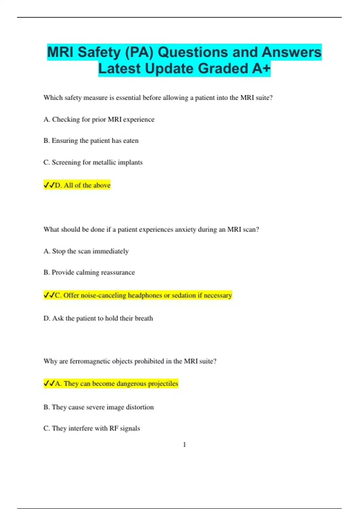 MRI Safety (PA) Questions and Answers Latest Update Graded A+ Which safety measure is essential before allowing a patient into the MRI suite? A. Checking for prior MRI experience B. Ensuring the patient has eaten C. Screening for metallic implants D. All of the above What should be done if a patient experiences anxiety during an MRI scan? A. Stop the scan immediately B. Provide calming reassurance C. Offer noise-canceling headphones or sedation if necessary D. Ask the patient to hold their breath Why are ferromagnetic objects prohibited in the MRI suite? A. They can become dangerous projectiles B. They cause severe image distortion C. They interfere with RF signals 2 D. They reduce scan time What is the primary risk of an MRI contrast agent for patients with kidney disease? A. Nephrogenic systemic fibrosis B. Radiation exposure C. Increased body temperature D. Lowered blood pressure Which personnel should have MRI safety training? A. Only radiologists B. Only MRI technologists C. All staff entering the MRI environment D. Only patients with implants What is the purpose of an MRI safety zone system? A. To label emergency exits B. To control access and reduce safety risks C. To organize the MRI workspace 3 D. To separate different imaging modalities Which of the following is true about pacemakers in MRI? A. All pacemakers are MRI-safe B. MRI has no effect on pacemakers C. Some pacemakers are conditional, while others are unsafe D. Pacemakers enhance MRI images What should a patient with a history of metal fragments in the eye undergo before an MRI? A. An orbital X-ray B. A neurological exam C. A cardiac stress test D. A contrast injection Why must hearing protection be provided during MRI scans? A. To improve patient relaxation B. To prevent hearing damage from loud gradient noise C. To enhance scan efficiency 4 D. To block outside noise interference Which factor affects the strength of the projectile effect in MRI? A. Magnetic field strength B. Patient’s weight C. Scan duration D. Room temperature What should be done if a fire breaks out in the MRI room? A. Use a standard fire extinguisher B. Shut down the magnet and remove all patients C. Use a non-ferromagnetic fire extinguisher and evacuate safely D. Keep the scan running to maintain safety protocols
