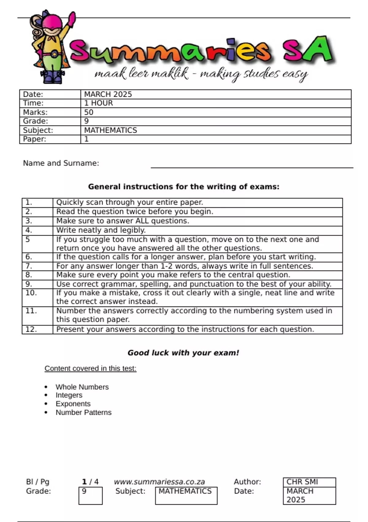 Grade 9 Mathematics March Test Paper and Memo: Total:  50 Marks. Contents of the exam paper contains the following details: Whole Numbers Integers Exponents Number Patterns This is a practice paper with memorandum meant to test the student's knowledge, and will not be the same paper written for the exam. DAN SMI