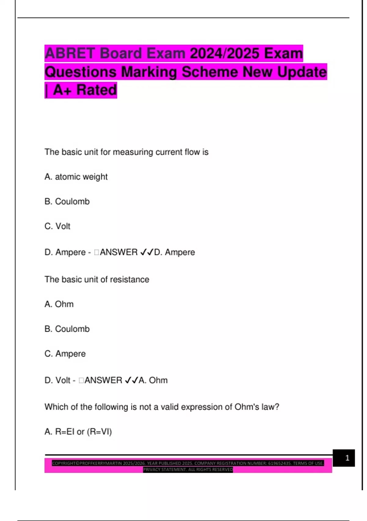 ABRET Board Exam 2024/2025 Exam Questions Marking Scheme New Update | A+ Rated The basic unit for measuring current flow is A. atomic weight B. Coulomb C. Volt D. Ampere -