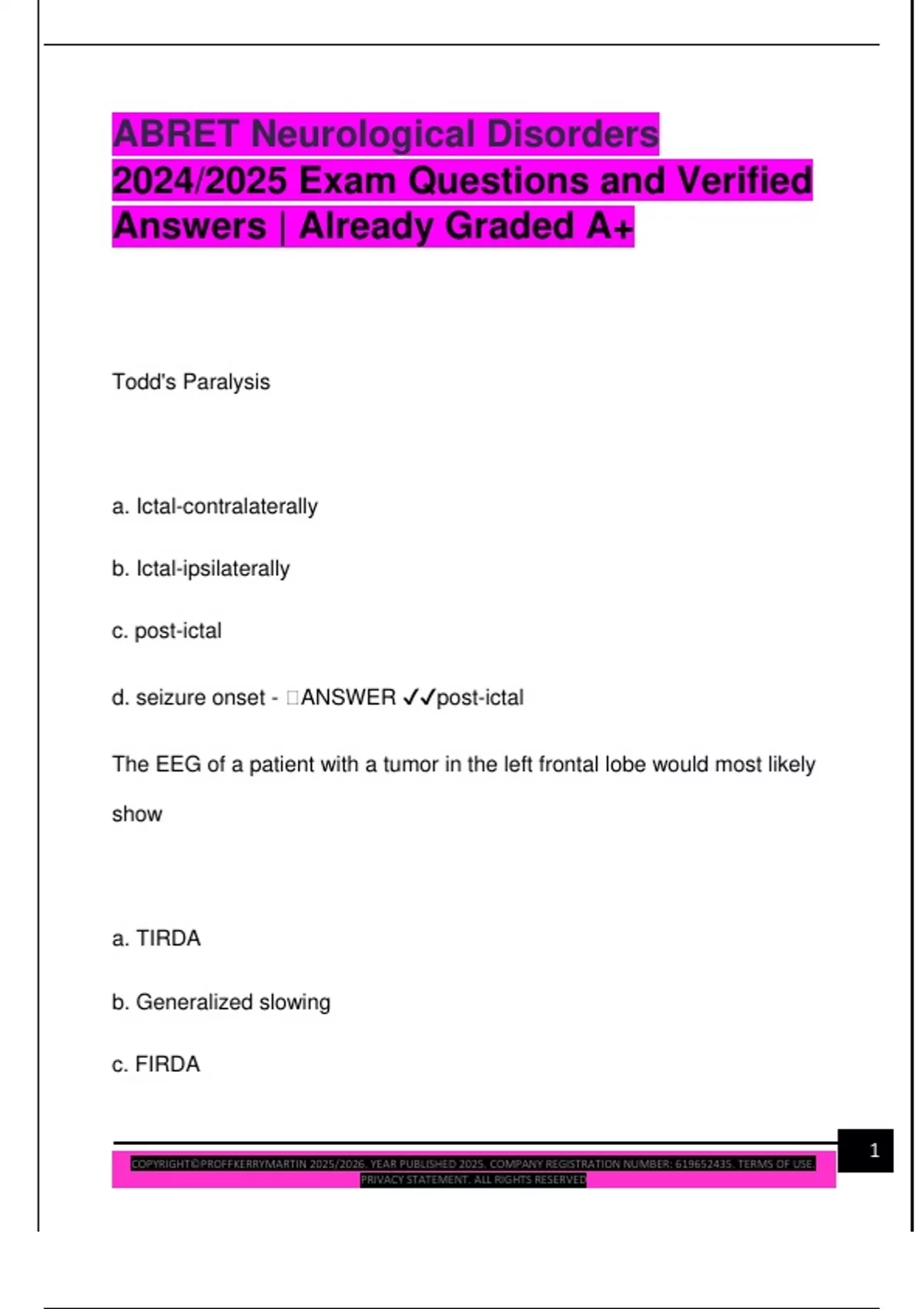 ABRET Neurological Disorders 2024/2025 Exam Questions and Verified Answers | Already Graded A+ Todd's Paralysis a. Ictal-contralaterally b. Ictal-ipsilaterally c. post-ictal d. seizure onset -