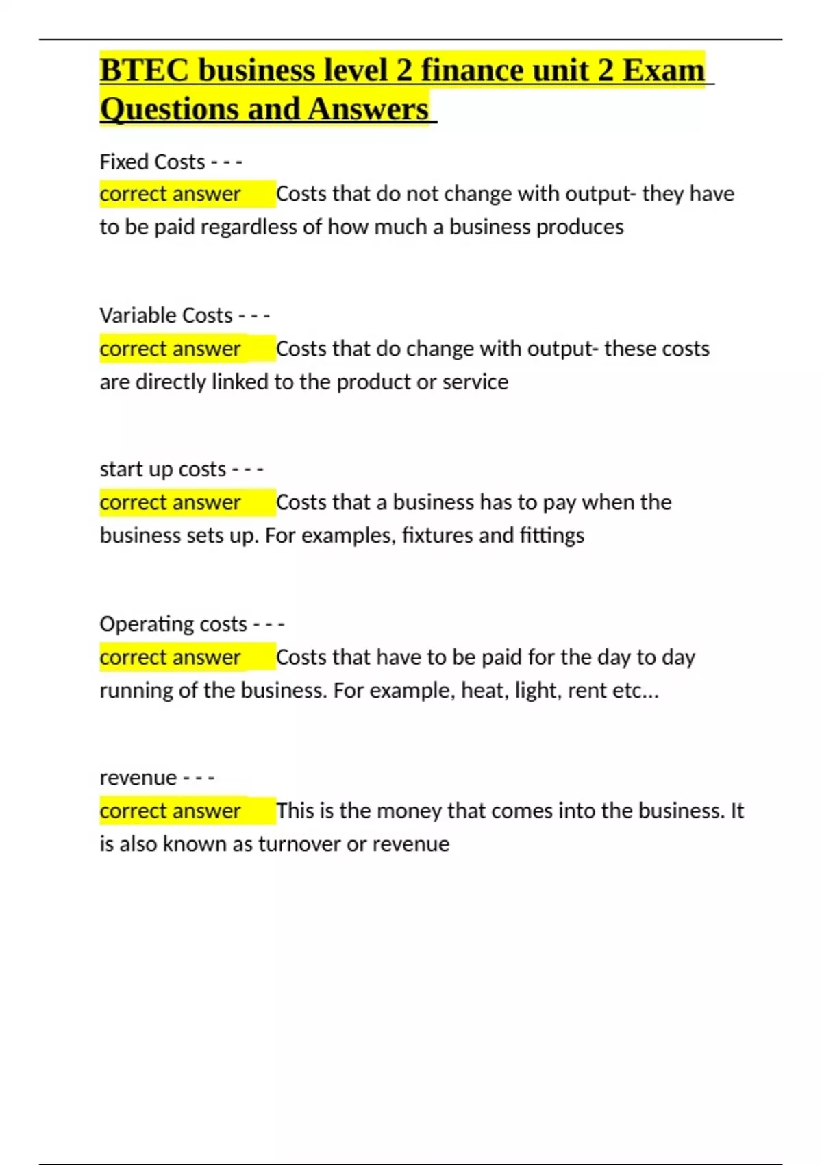 BTEC business level 2 finance unit 2 Exam Questions and A