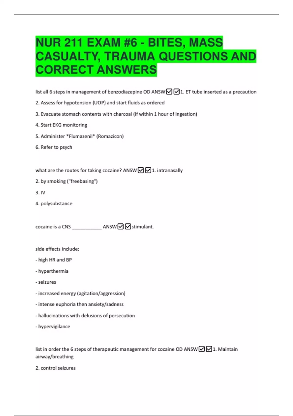 list in order the 6 steps of therapeutic management for cocaine OD ANSW✅✅1. Maintain