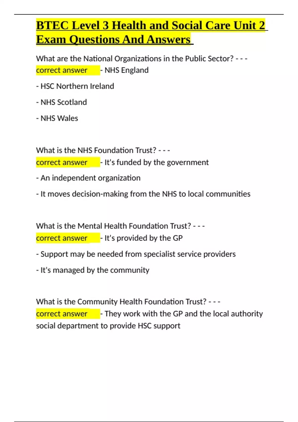 BTEC Level 3 Health and Social Care Unit 2 Exam Questions And A