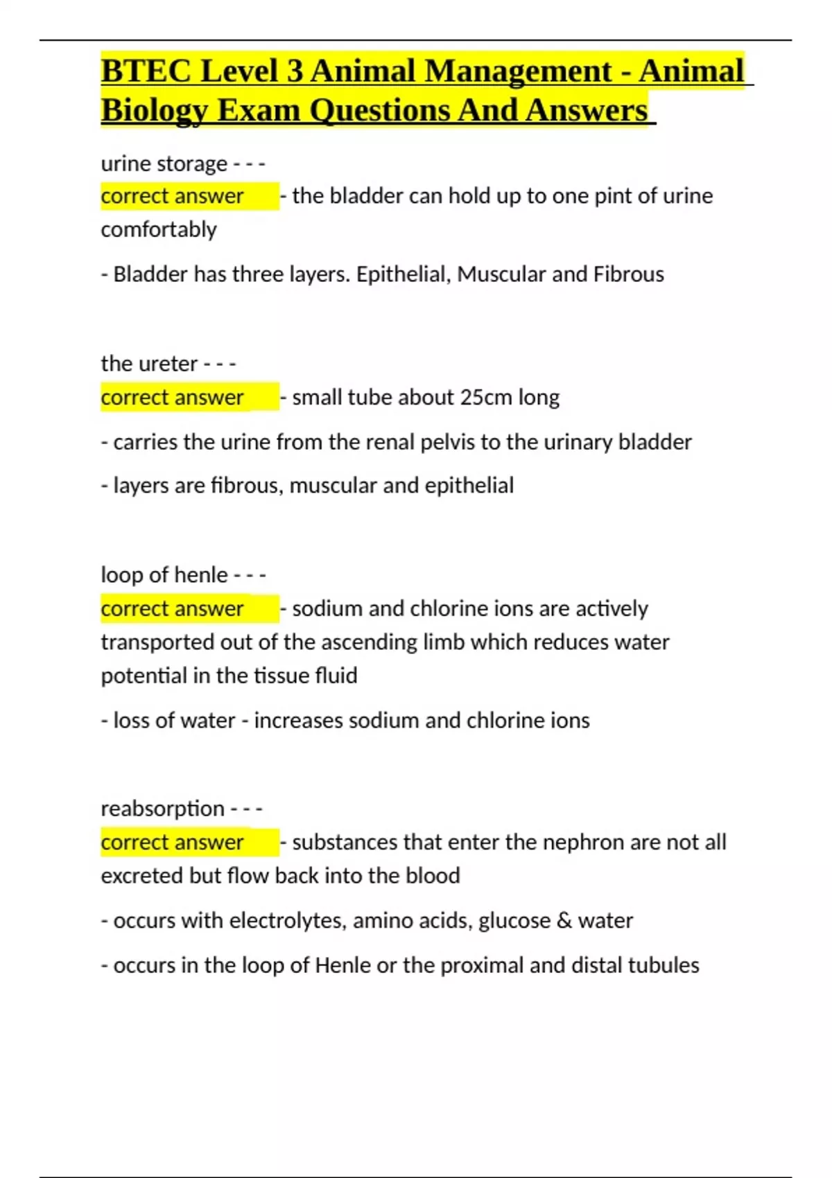 BTEC Level 3 Animal Management - Animal Biology Exam Questions And A