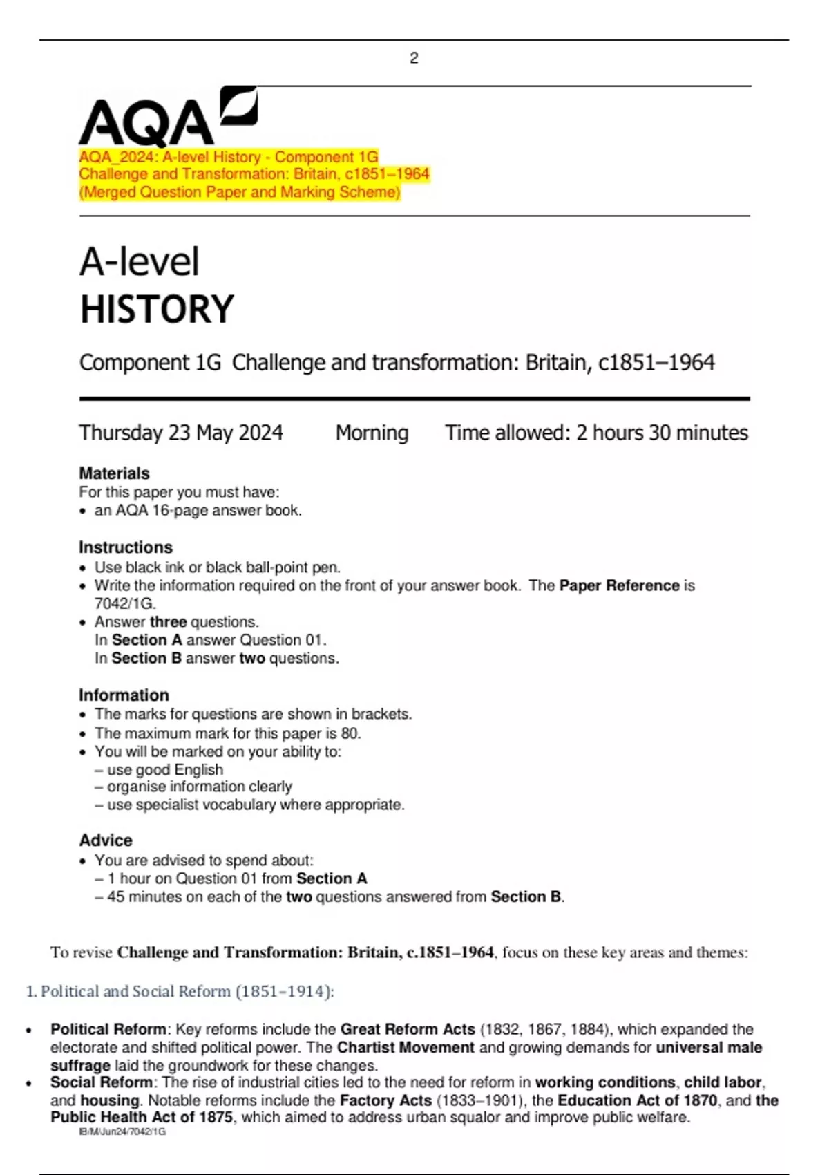 AQA_2024: A-level History - Component 1G Challenge and Transformation: Britain, c1851–1964 (Merged Question Paper and Marking Scheme)