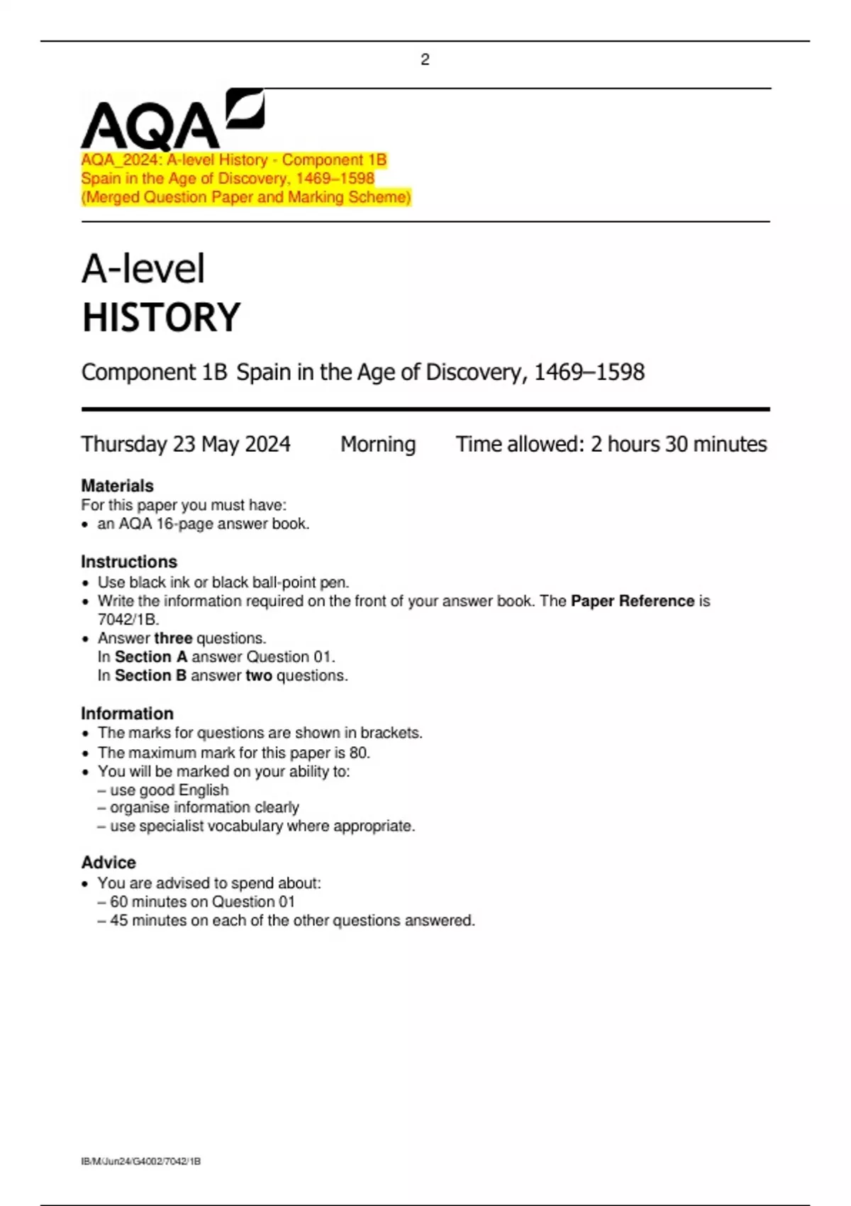 AQA_2024: A-level History - Component 1B Spain in the Age of Discovery, 1469–1598 (Merged Question Paper and Marking Scheme)